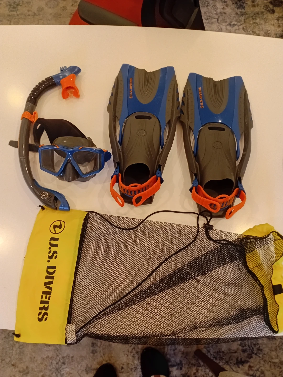 This U.S. Divers set includes a snorkel, mask, and fins. It also comes with a mesh bag for easy transport. This gear's good for beach trips or swimming fun!