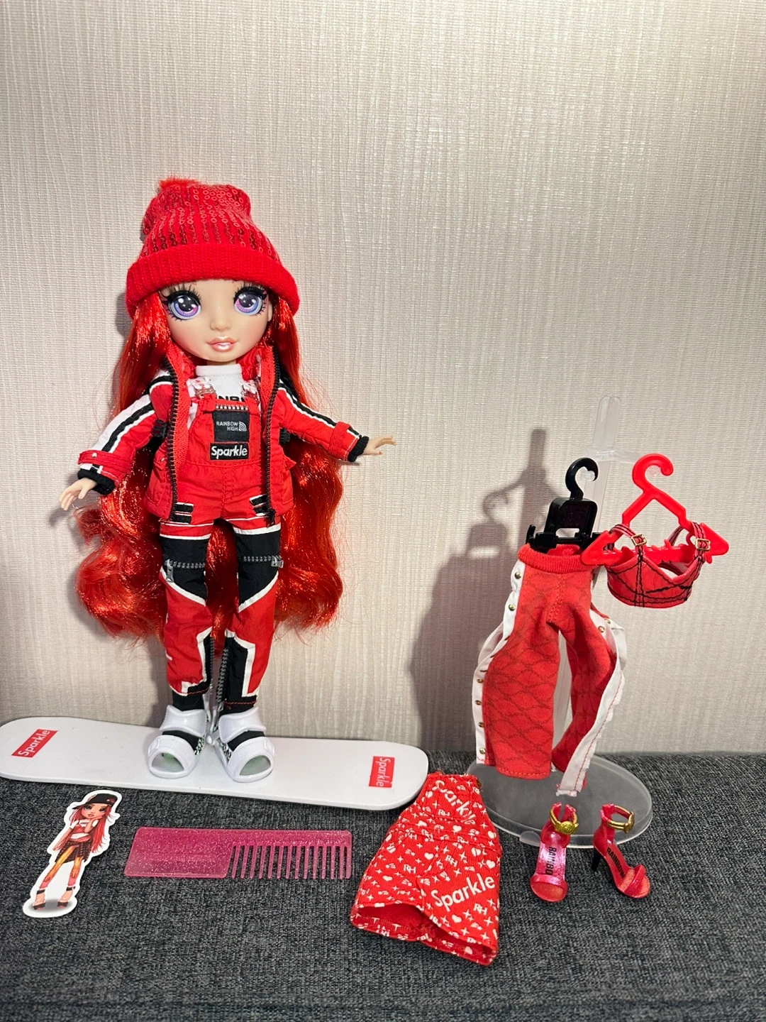 This is the Ruby Anderson doll from Rainbow High's Winter Break collection. It comes with a red snowboard and multiple red and black ski-themed outfits.