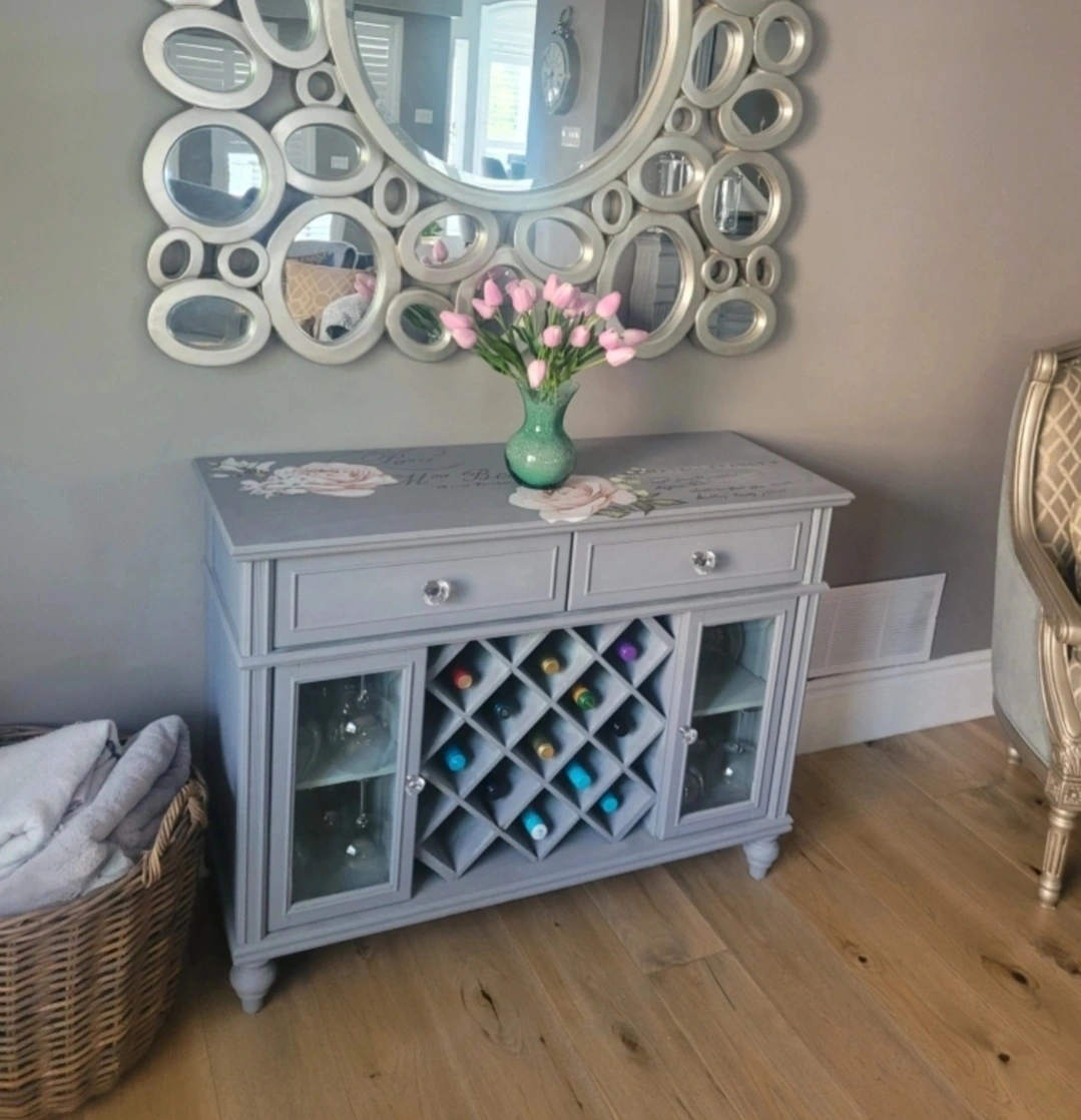 A lovely cabinet with two drawers, glass doors, and a wine rack. Perfect for storing your favorite bottles of wine and serving your guests. Has been painted in a beautiful grey color and features beautiful decals. These lovely french decals with pink bloomed flowers Compliments the soft gray tones. This cabinet is great for storing your wine glasses.Your sangria glasses. Many glasses.