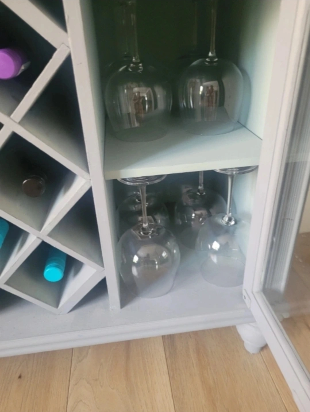 The cabinets hold a dozen largeglasses on each side, six per shelf. Mine in this picture are very large sangria glasses. So lots of space. Made of solid wood, I repurposed a lovely bombay cabinet. Also, inside these drawers are still it's natural wood.