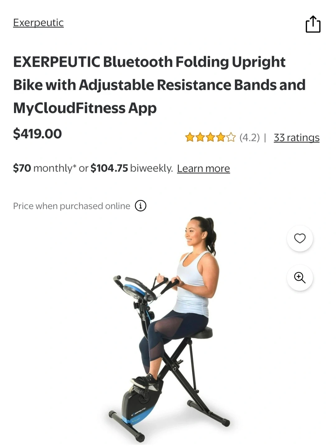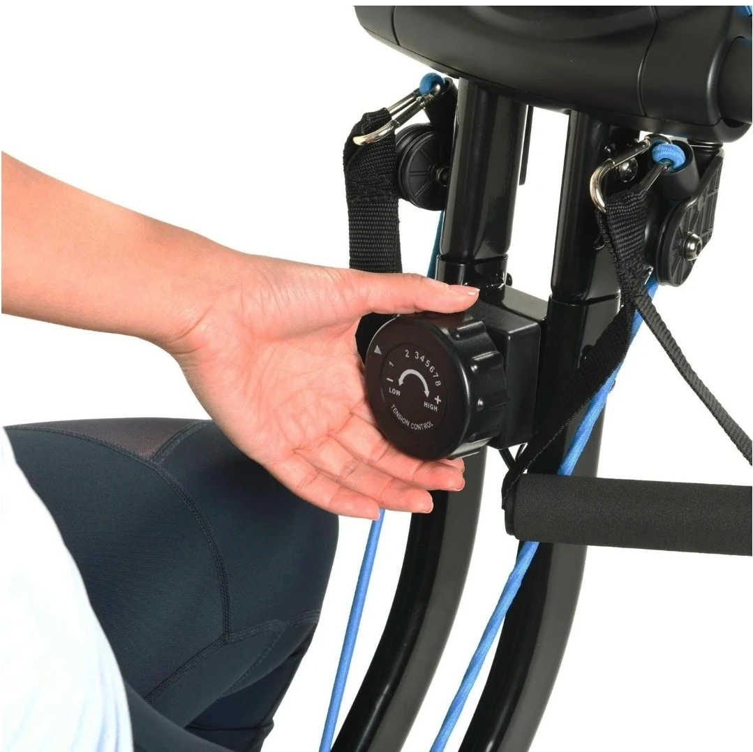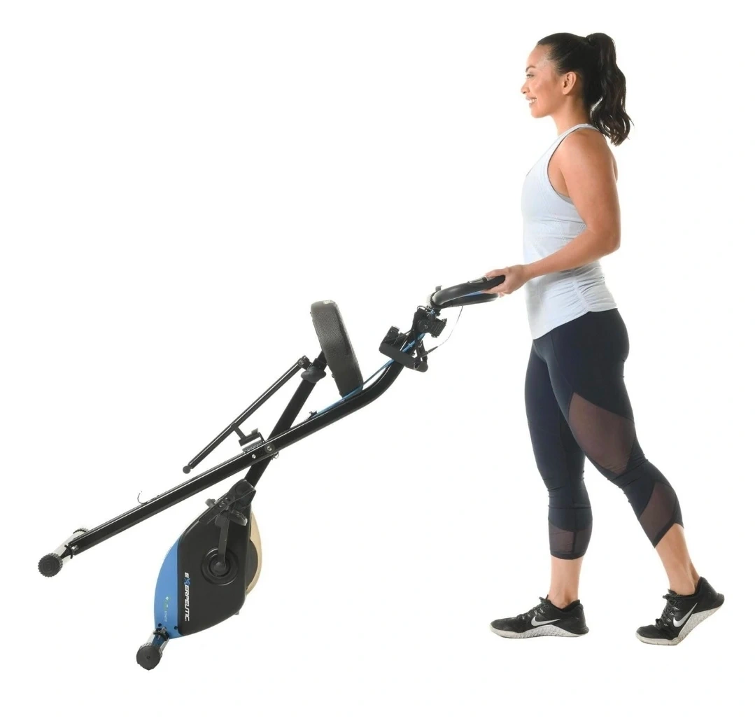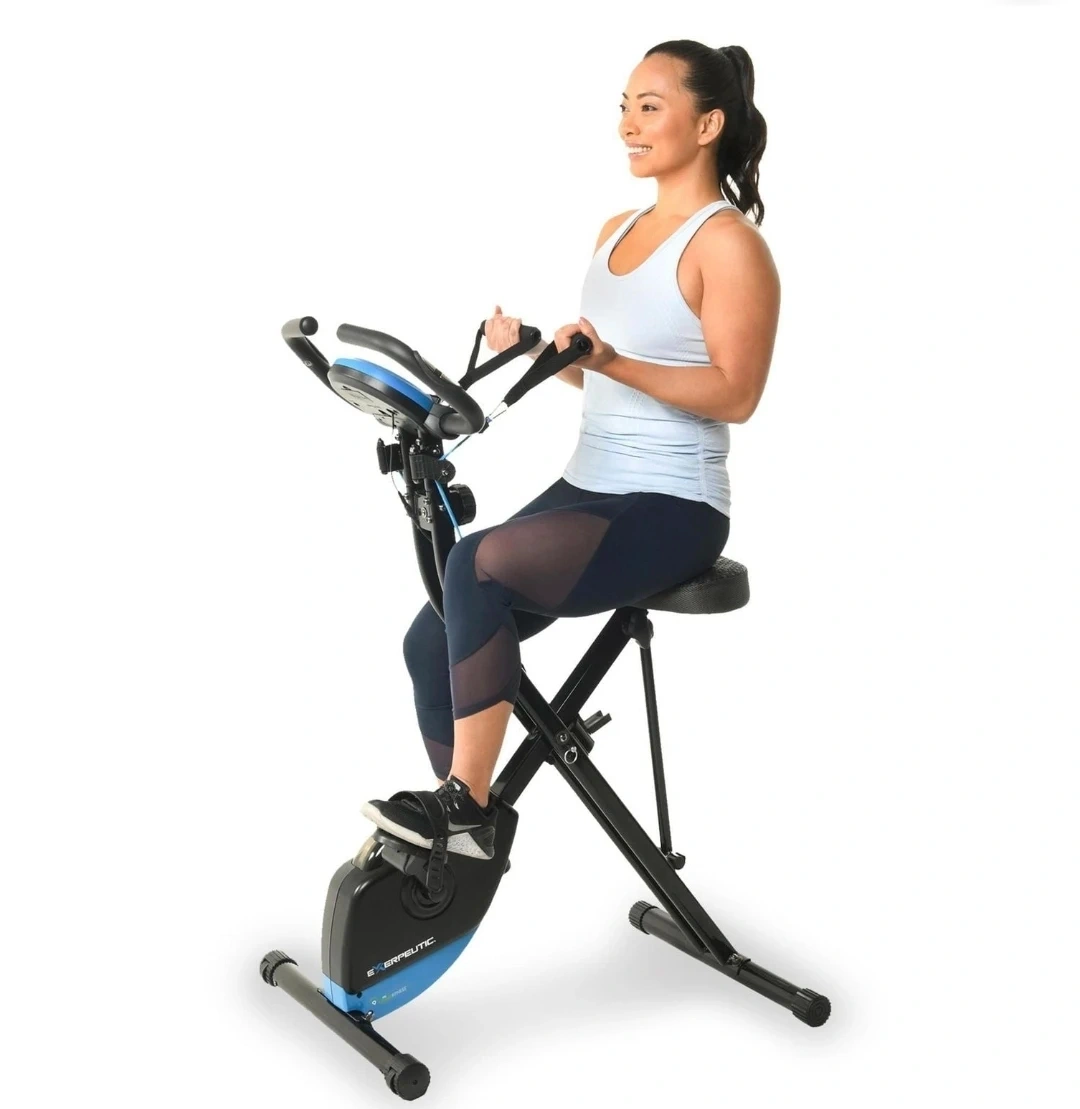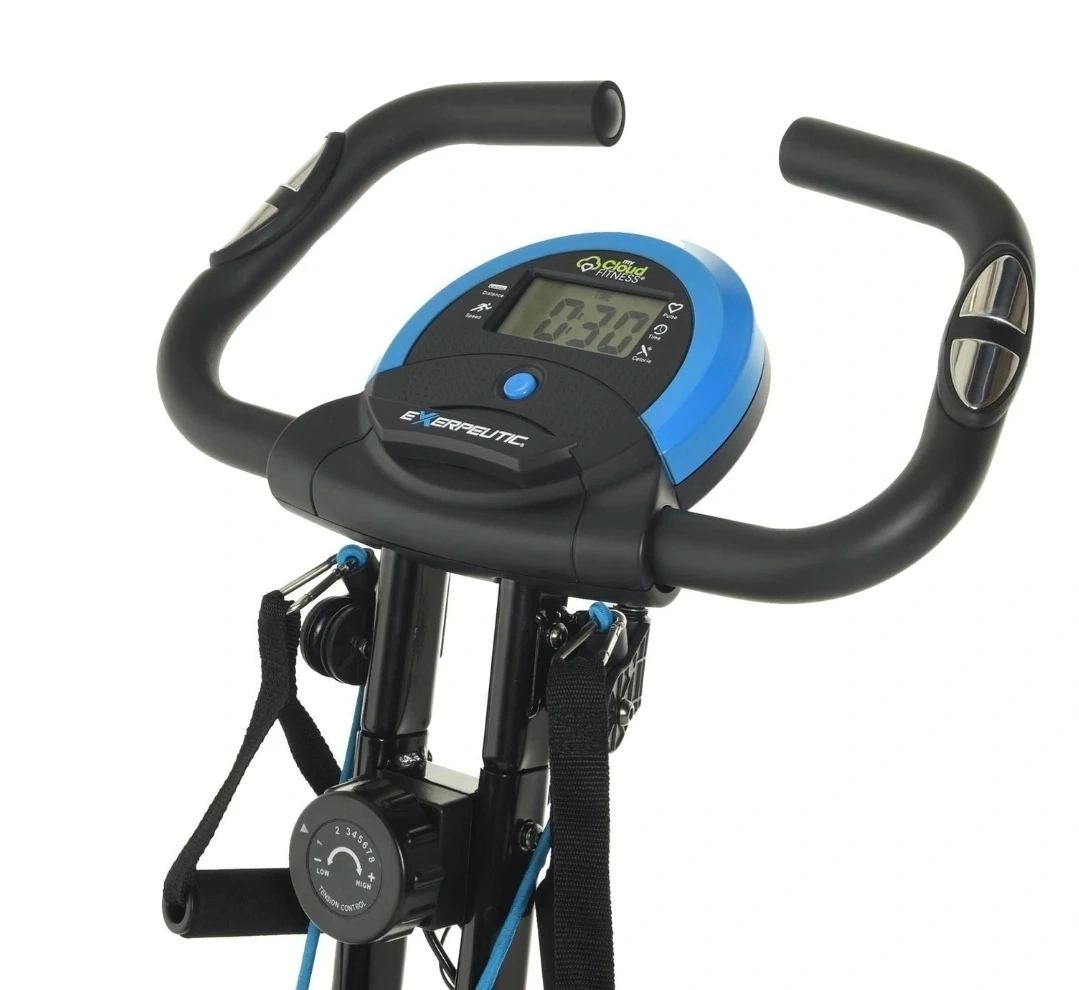 This EXERPEUTIC upright bike offers Bluetooth connectivity and built-in resistance bands for a full-body workout. It's designed to be foldable for easy storage. The bike has adjustable resistance to suit your fitness level.
