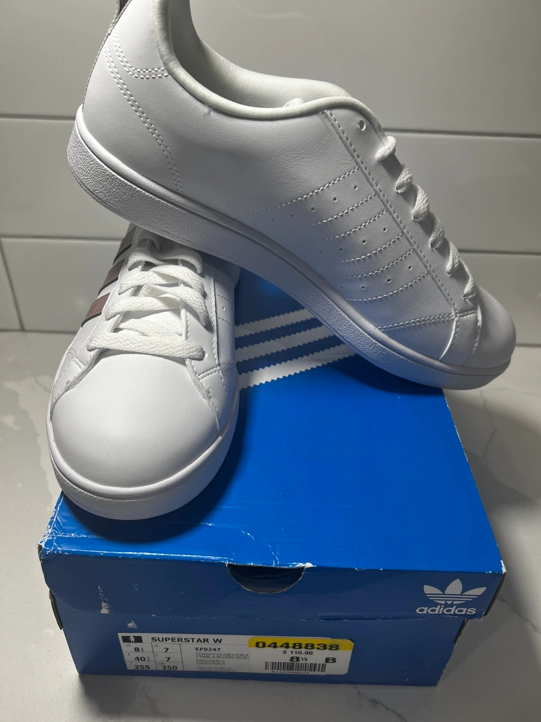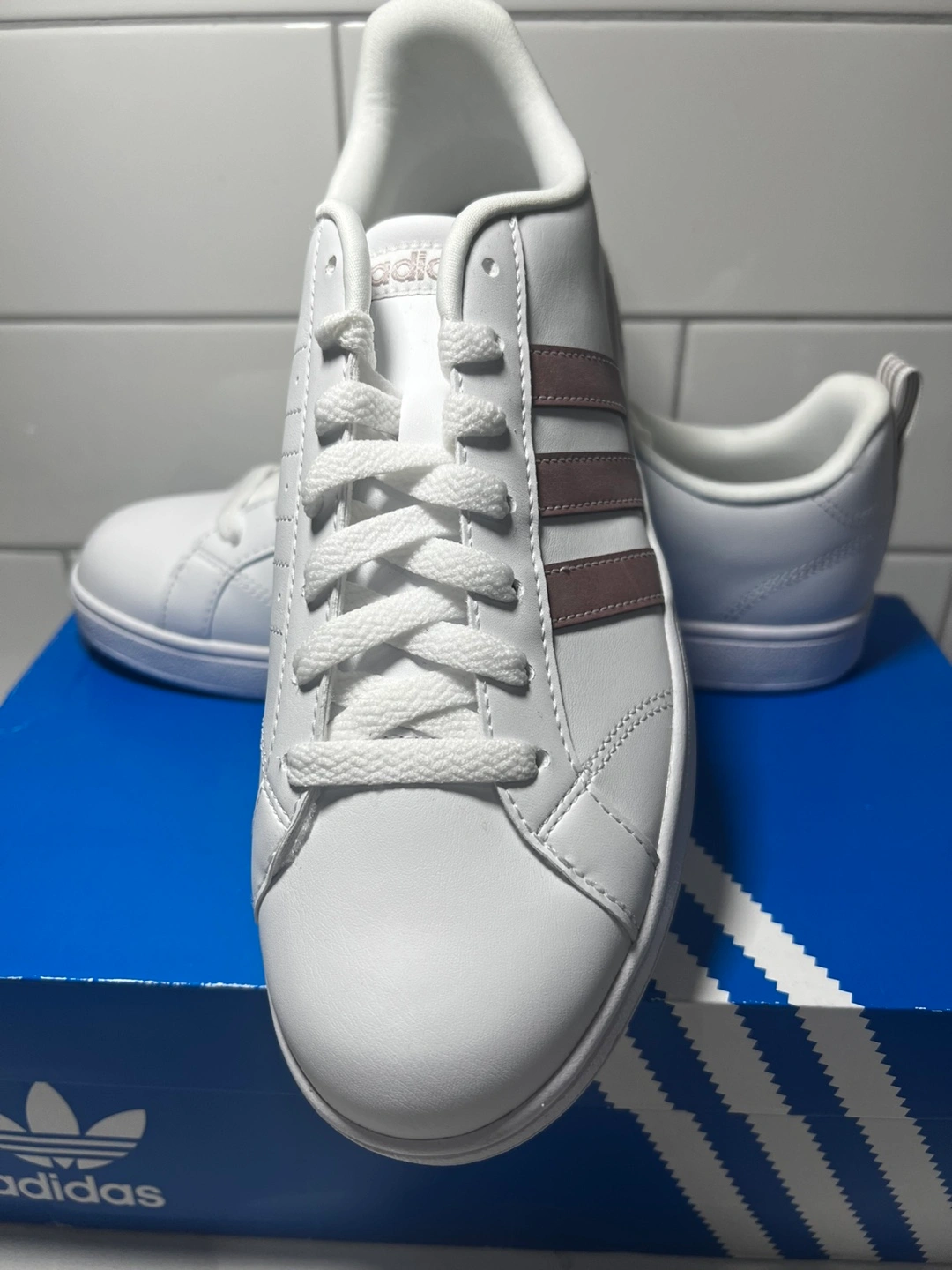 New woman’s Adidas grand court sneakers with rose gold stripes.