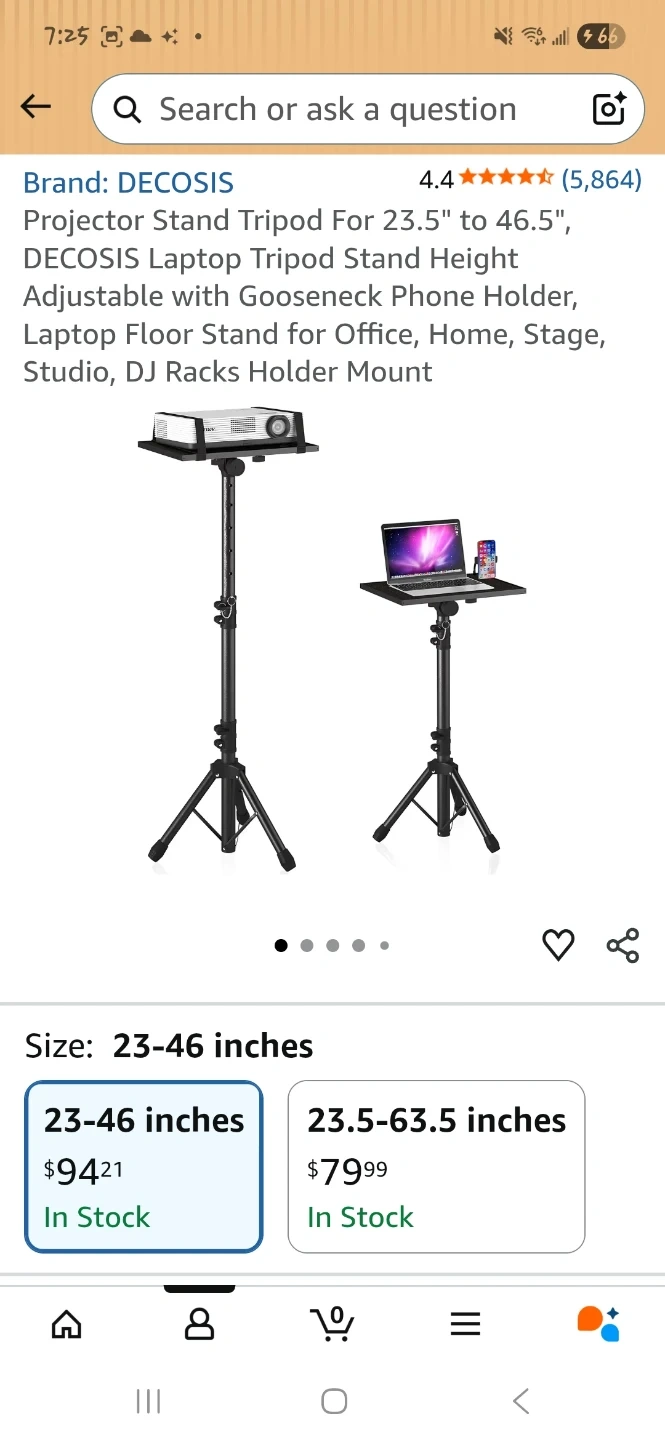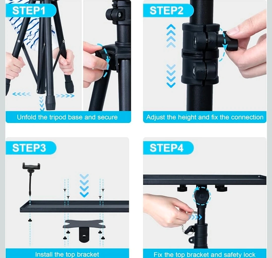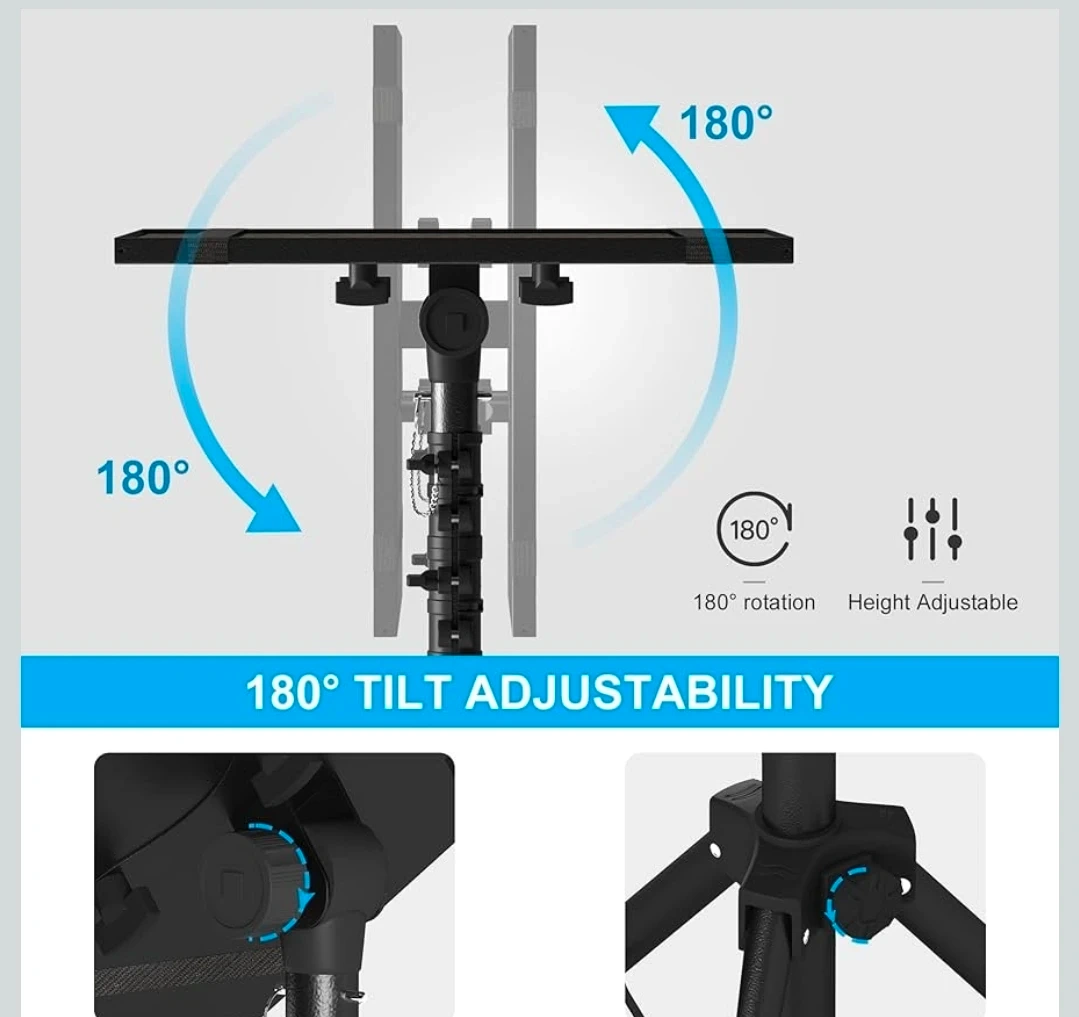This DECOSIS stand is height adjustable from 23.5 to 46.5 inches. It includes a goose-neck phone holder and a thickened anti-skid pad for stability. It's suitable for projectors, laptops, or sheet music.