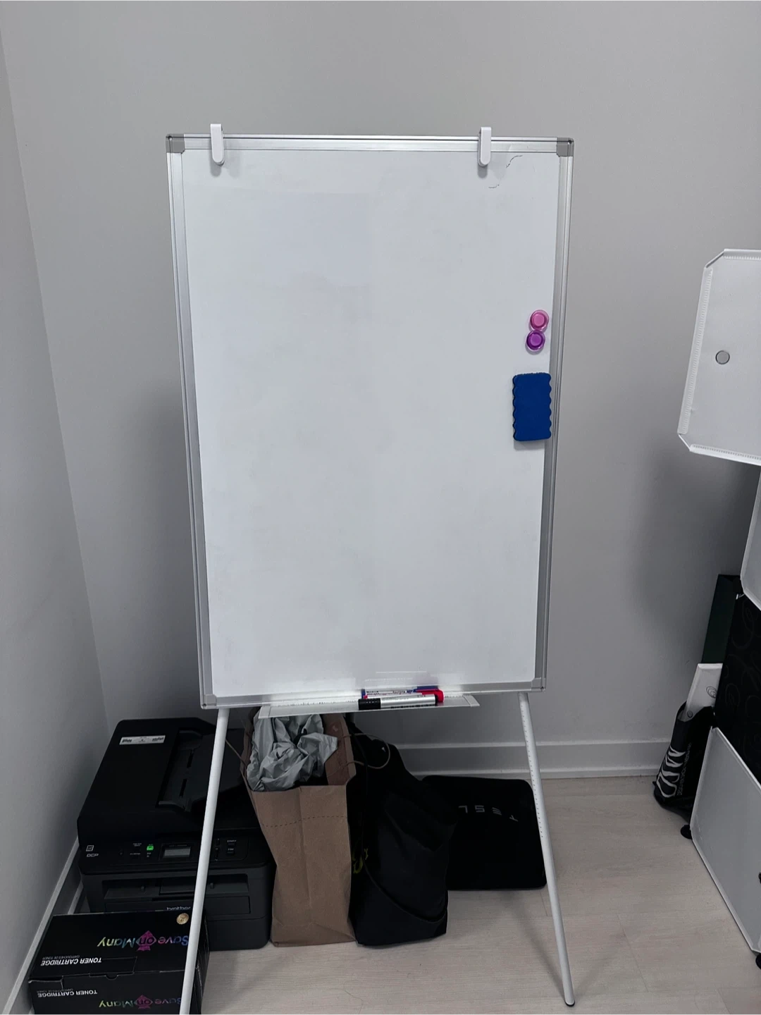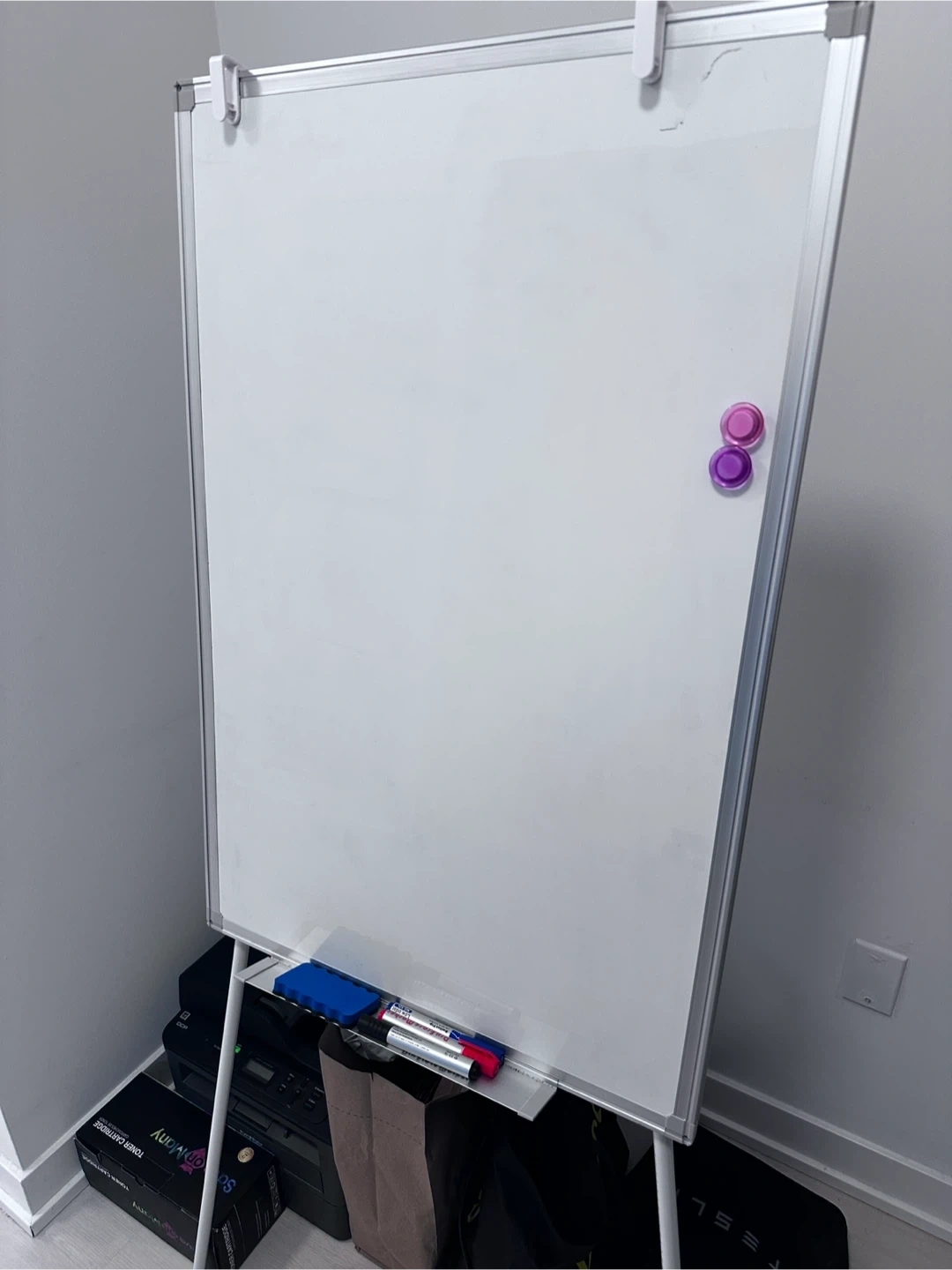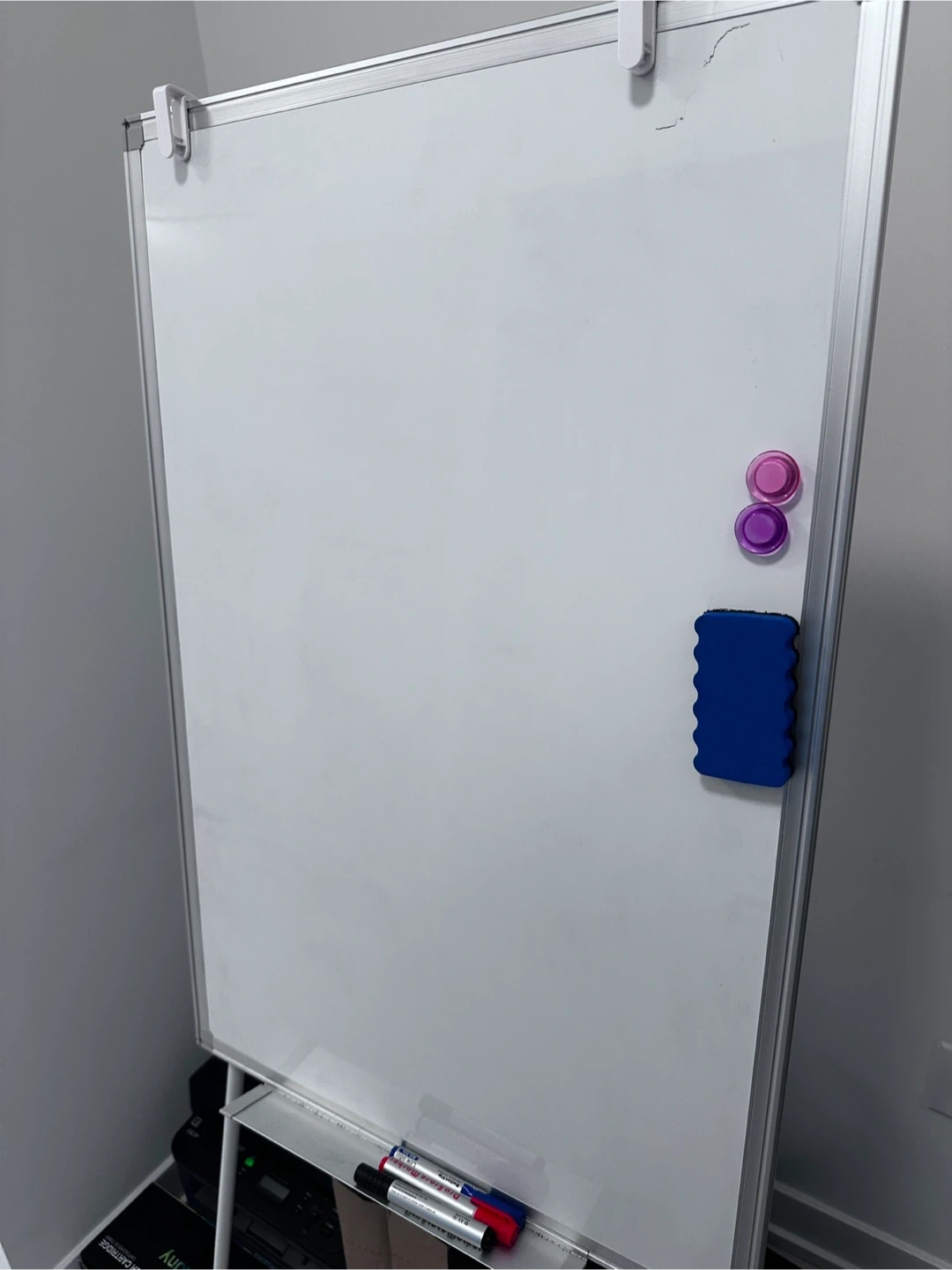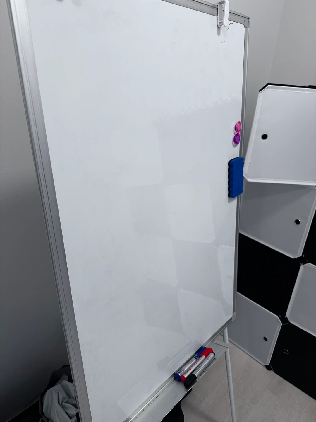 A whiteboard on a stand with magnetic holders and an eraser. It's great for brainstorming or presentations. Includes two magnets and a blue eraser. Overall height is 57 inch