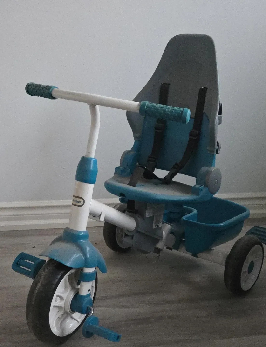 Selling a Little Tikes 4-in-1 Trike in blue. It's a great way for your little one to learn how to ride! It has a safety harness and adjustable seat.