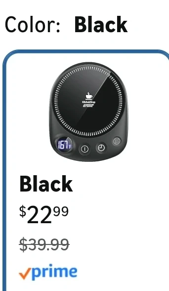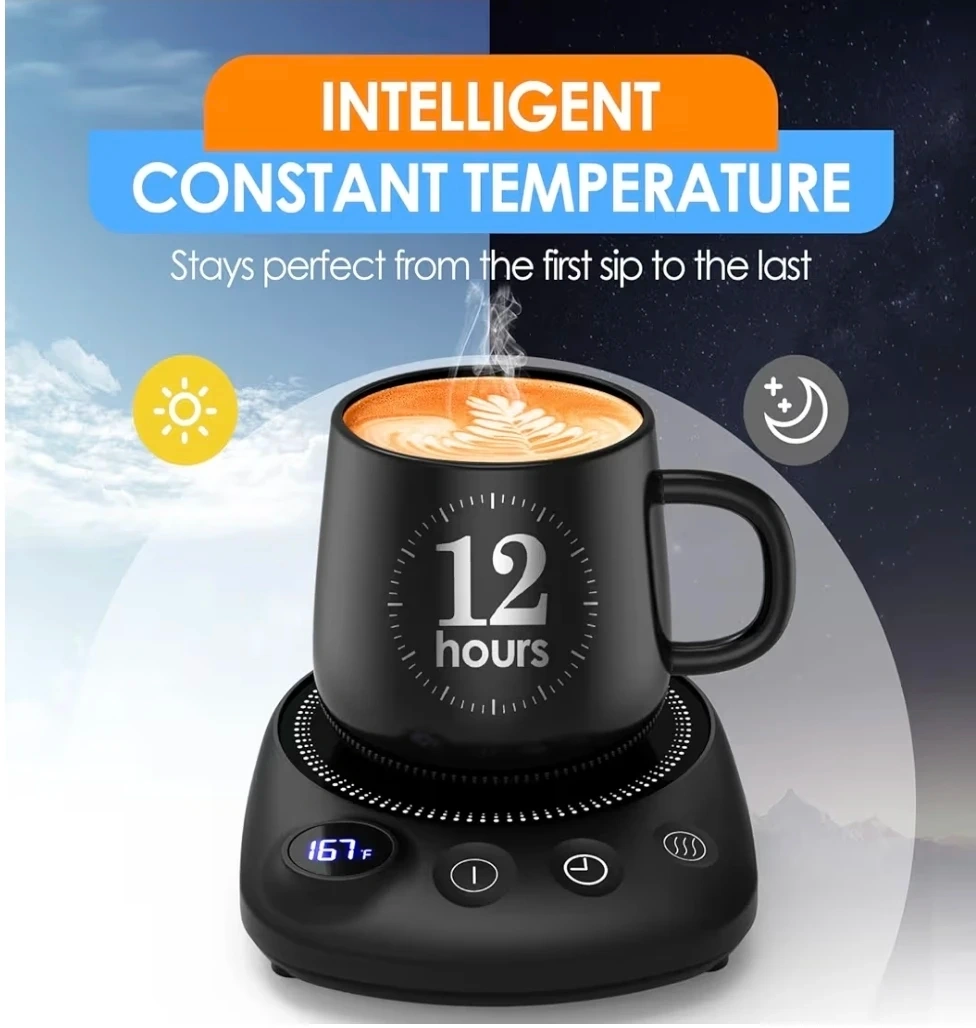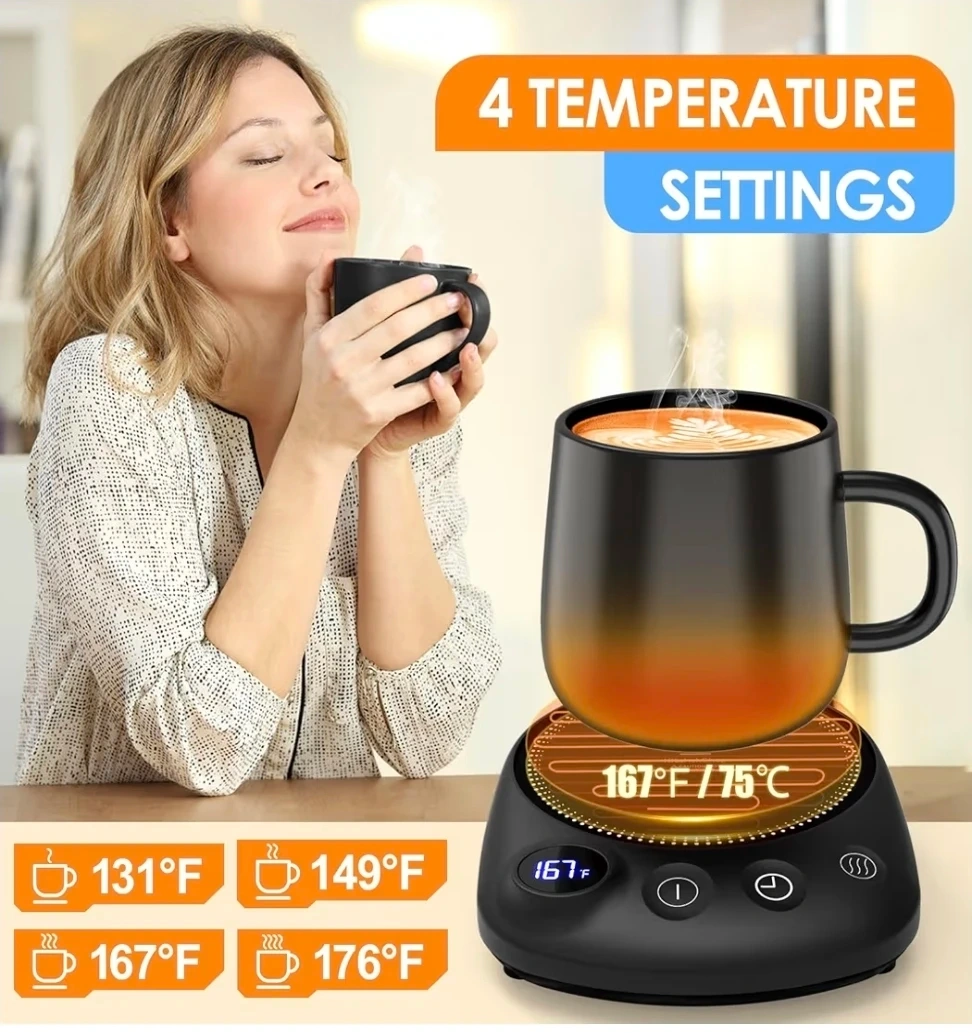 š„This KitcheShop coffee mug warmer is black and features intelligent constant temperature. It has 4 temperature settings and a 1-12 hour timer with auto shut-off. It's designed for coffee, tea, and other beverages.