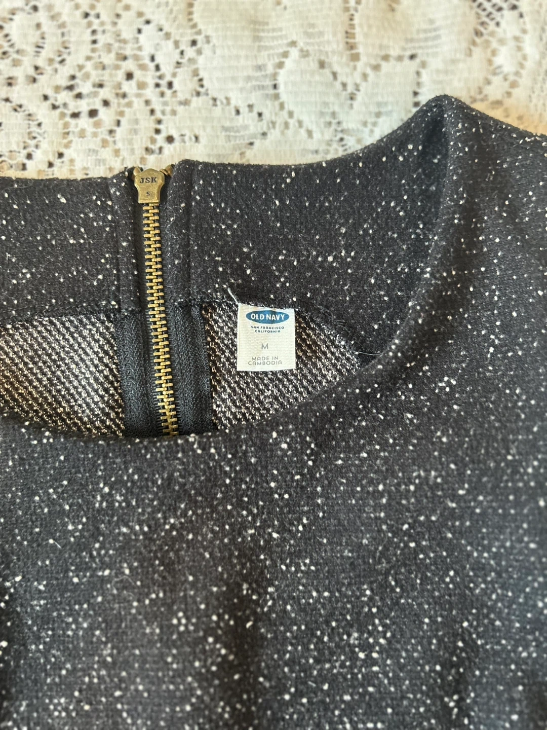 Old Navy sleeveless sheath dress in black with a subtle sparkle. It's a size medium and has a back zipper closure. This dress is perfect for a night out or a special occasion
