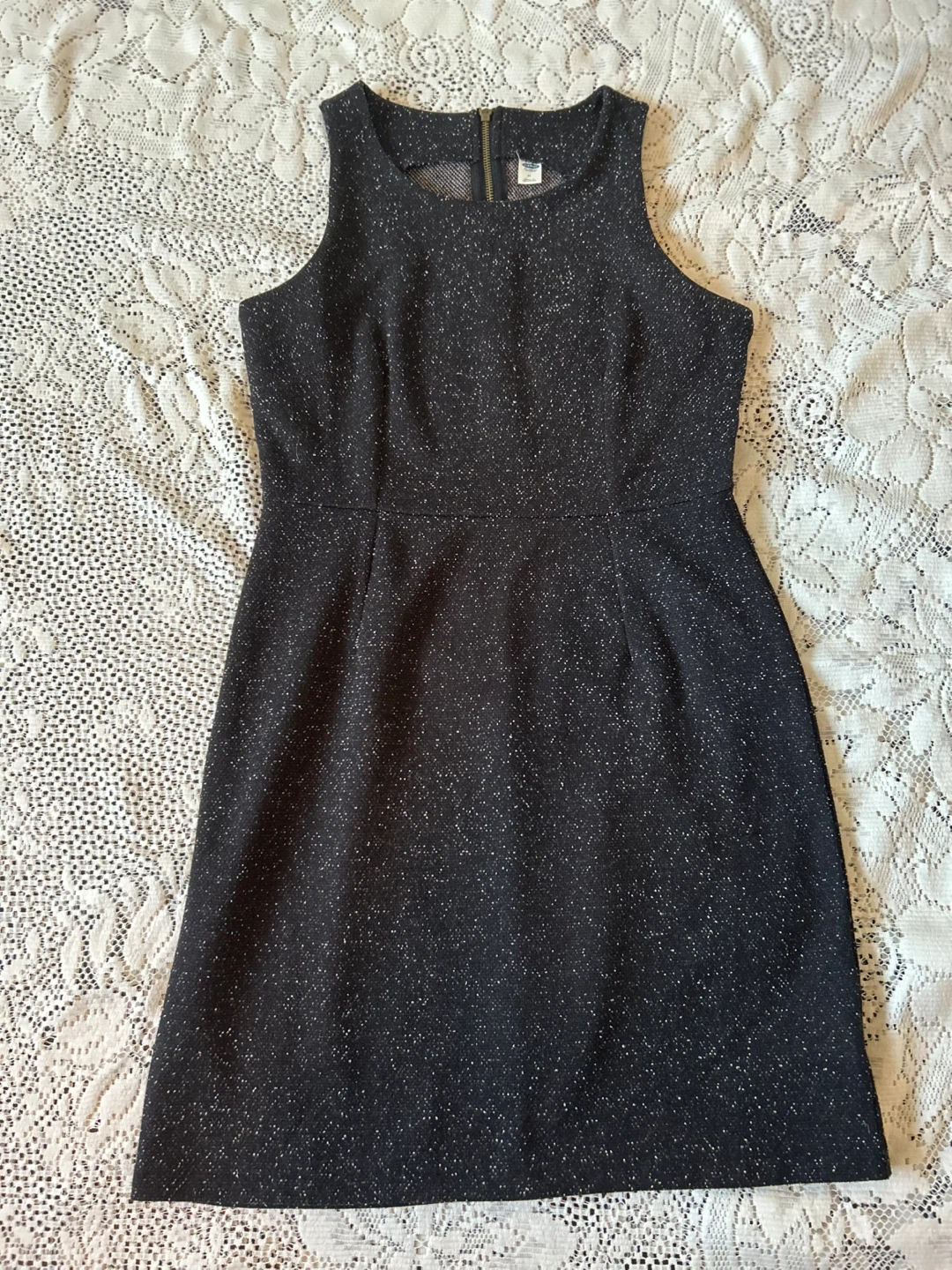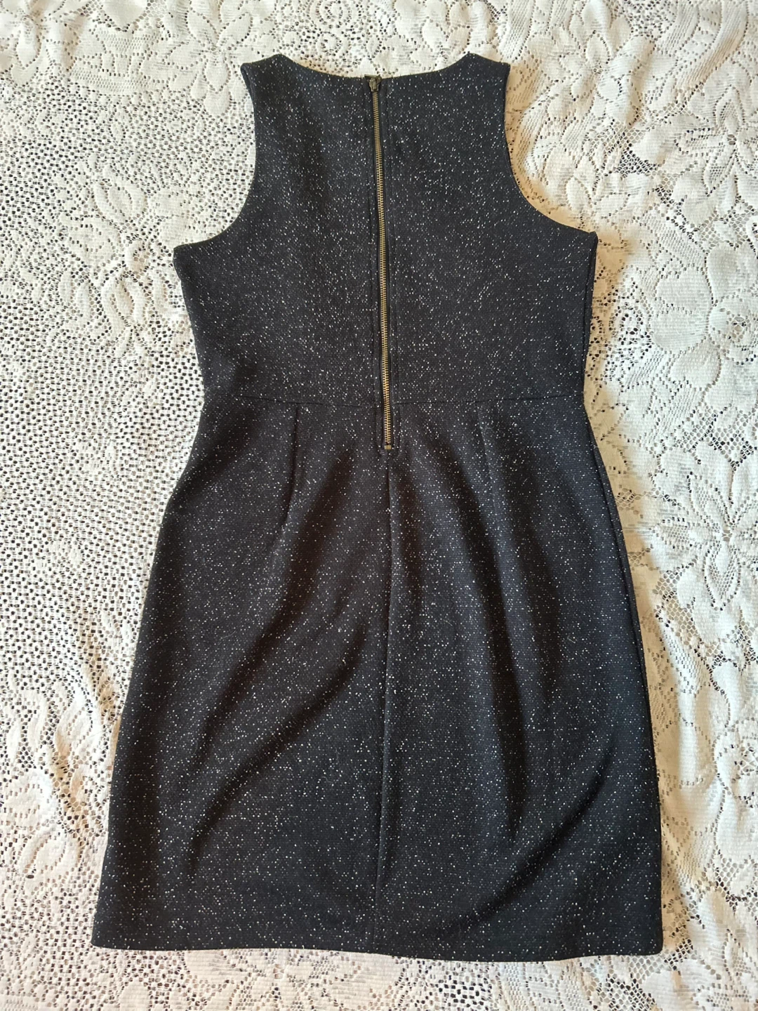 Old Navy sleeveless sheath dress in black with a subtle sparkle. It's a size medium and has a back zipper closure. This dress is perfect for a night out or a special occasion