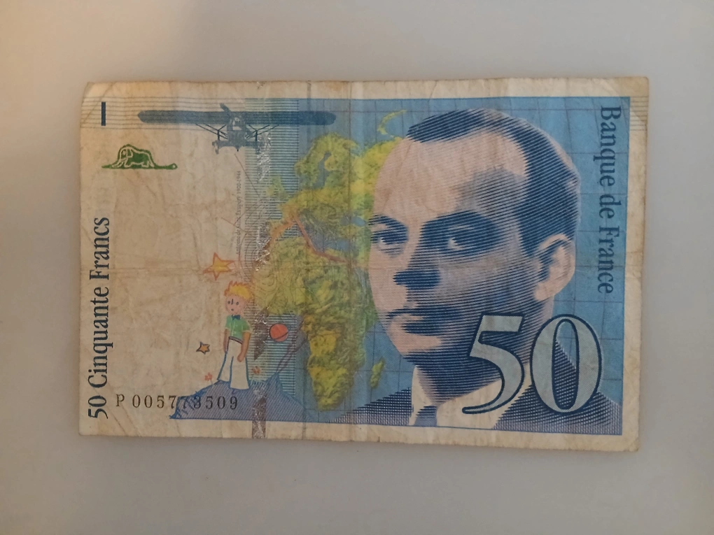 This is a 50 Franc banknote from France, featuring imagery inspired by The Little Prince. The banknote has a denomination of 50 francs and was issued in 1993. It shows a portrait on one side and an illustration with an airplane and celestial elements on the other.