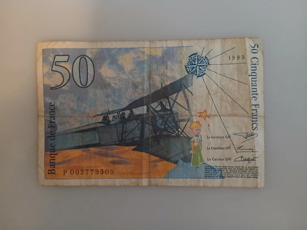 This is a 50 Franc banknote from France, featuring imagery inspired by The Little Prince. The banknote has a denomination of 50 francs and was issued in 1993. It shows a portrait on one side and an illustration with an airplane and celestial elements on the other.