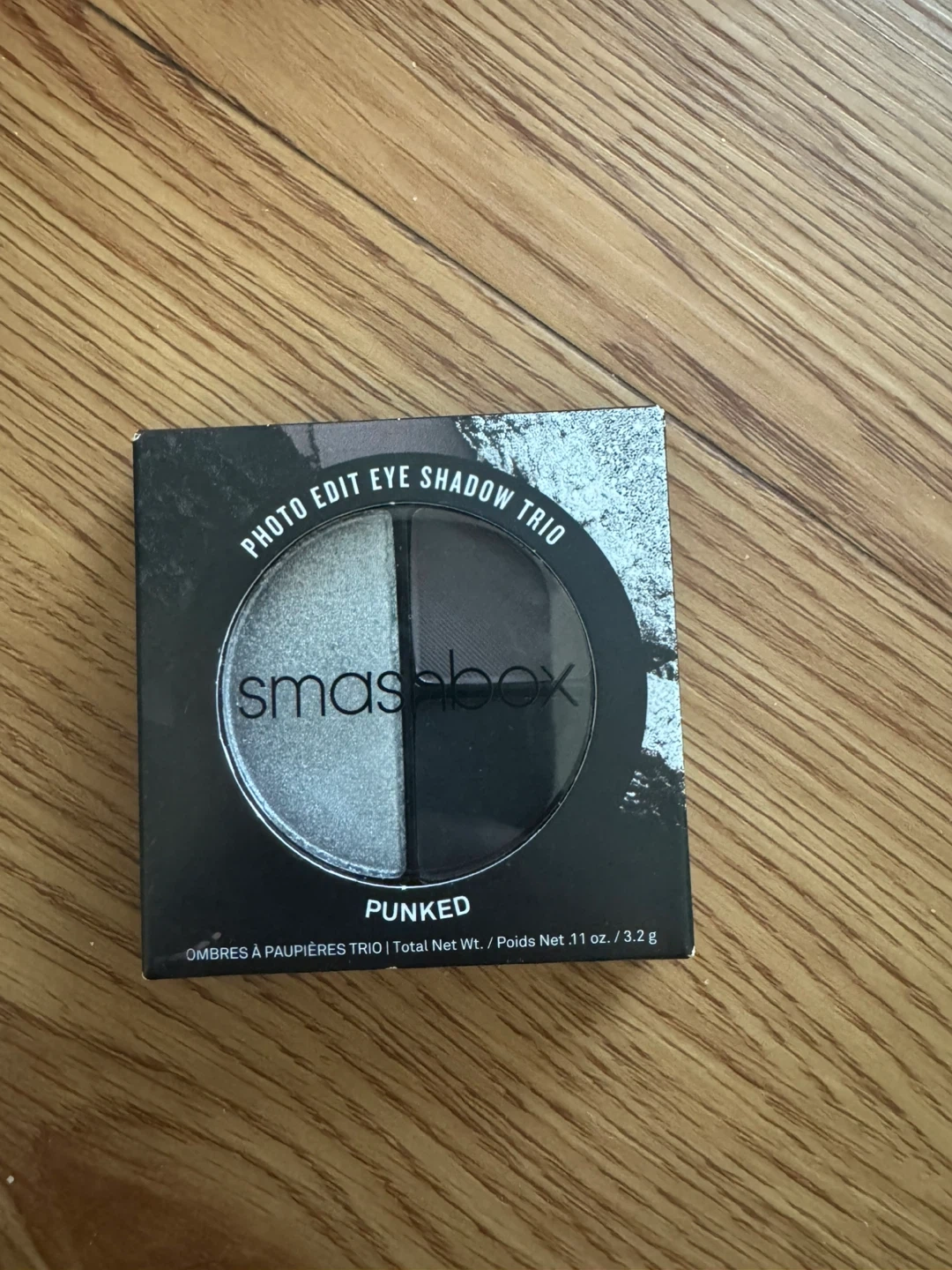 This is the Smashbox Photo Edit Eye Shadow Trio in the shade Punked. It's a compact trio with two complementary shades for easy eye looks. Net weight is 0.11 oz. / 3.2 g.