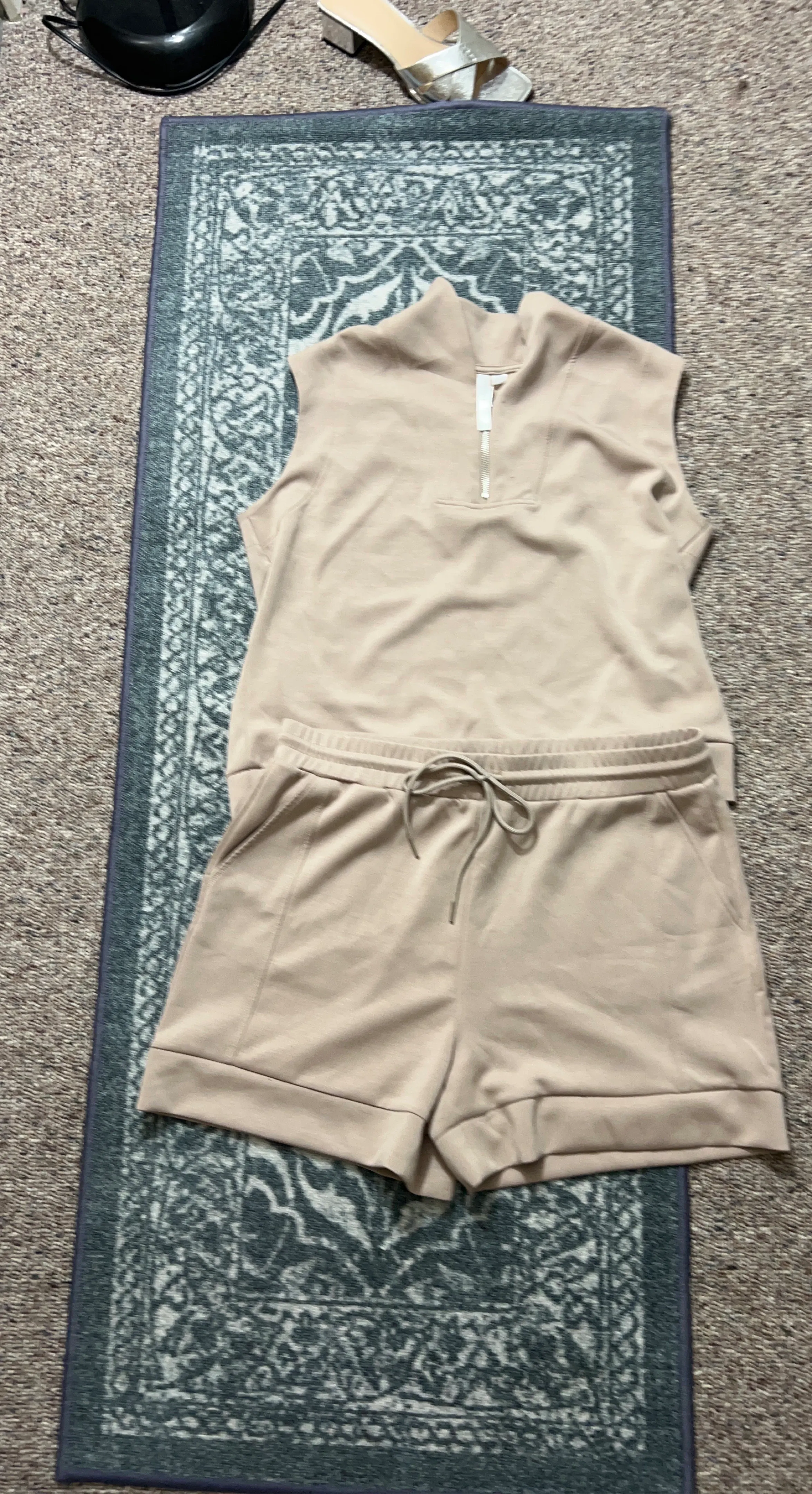 XL Comfortable Ezy Wear by CHI tan sweat set. Includes a quarter-zip sleeveless top and matching elastic waist shorts with a drawstring. Never used!