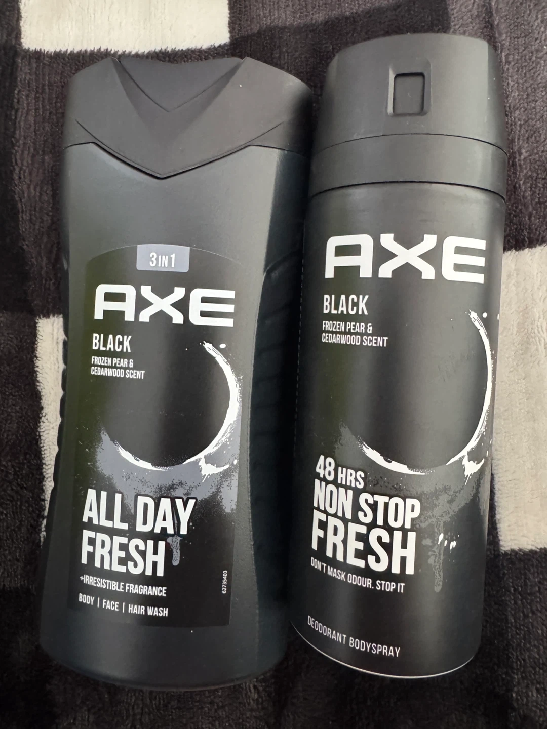 This AXE Black gift set includes a Deodorant Bodyspray and a 3-in-1 All Day Fresh Bodywash. Both have a Frozen Pear & Cedarwood scent. The bodyspray offers 48 hrs non-stop fresh, and the bodywash is for body, face, and hair.