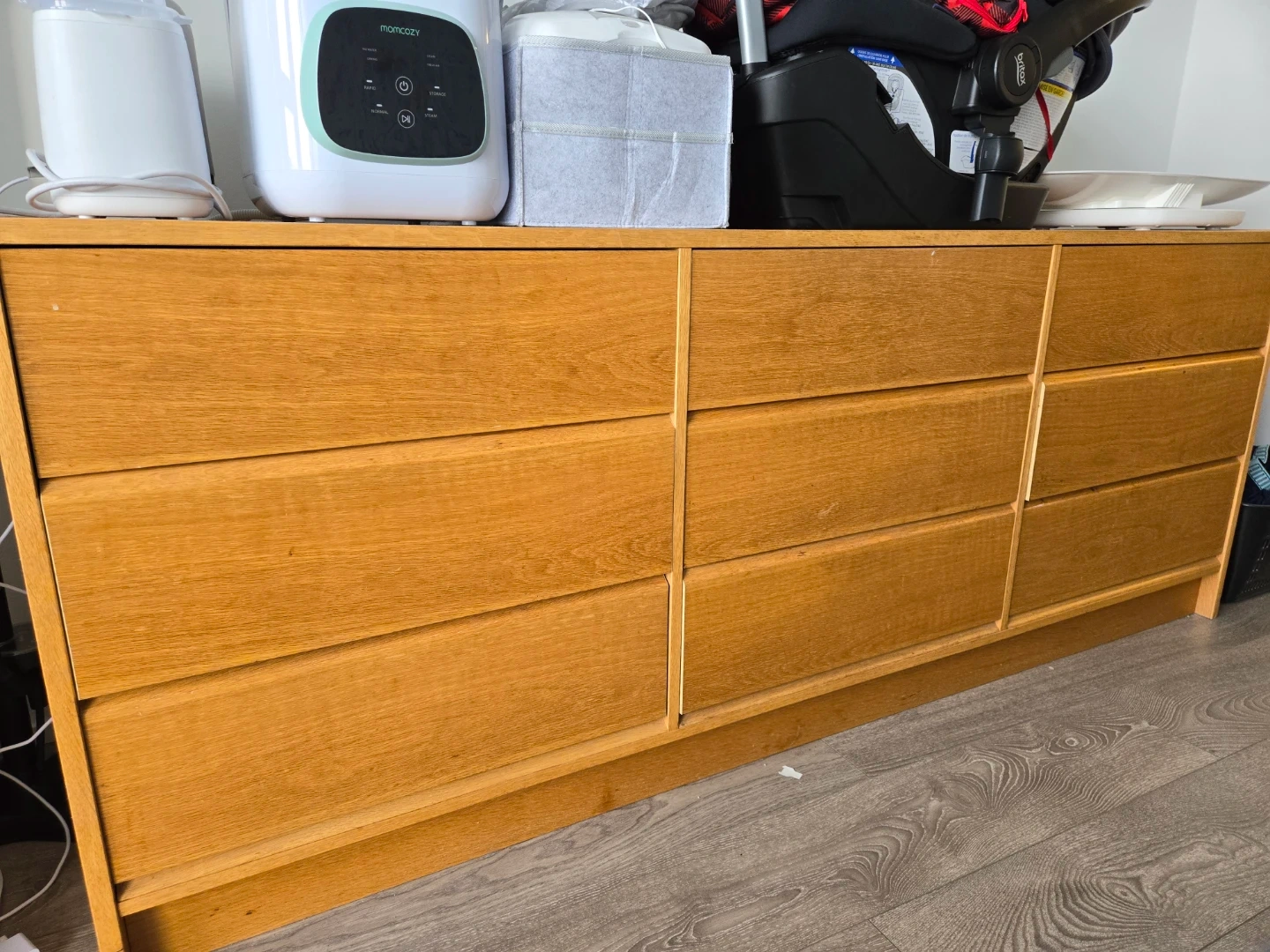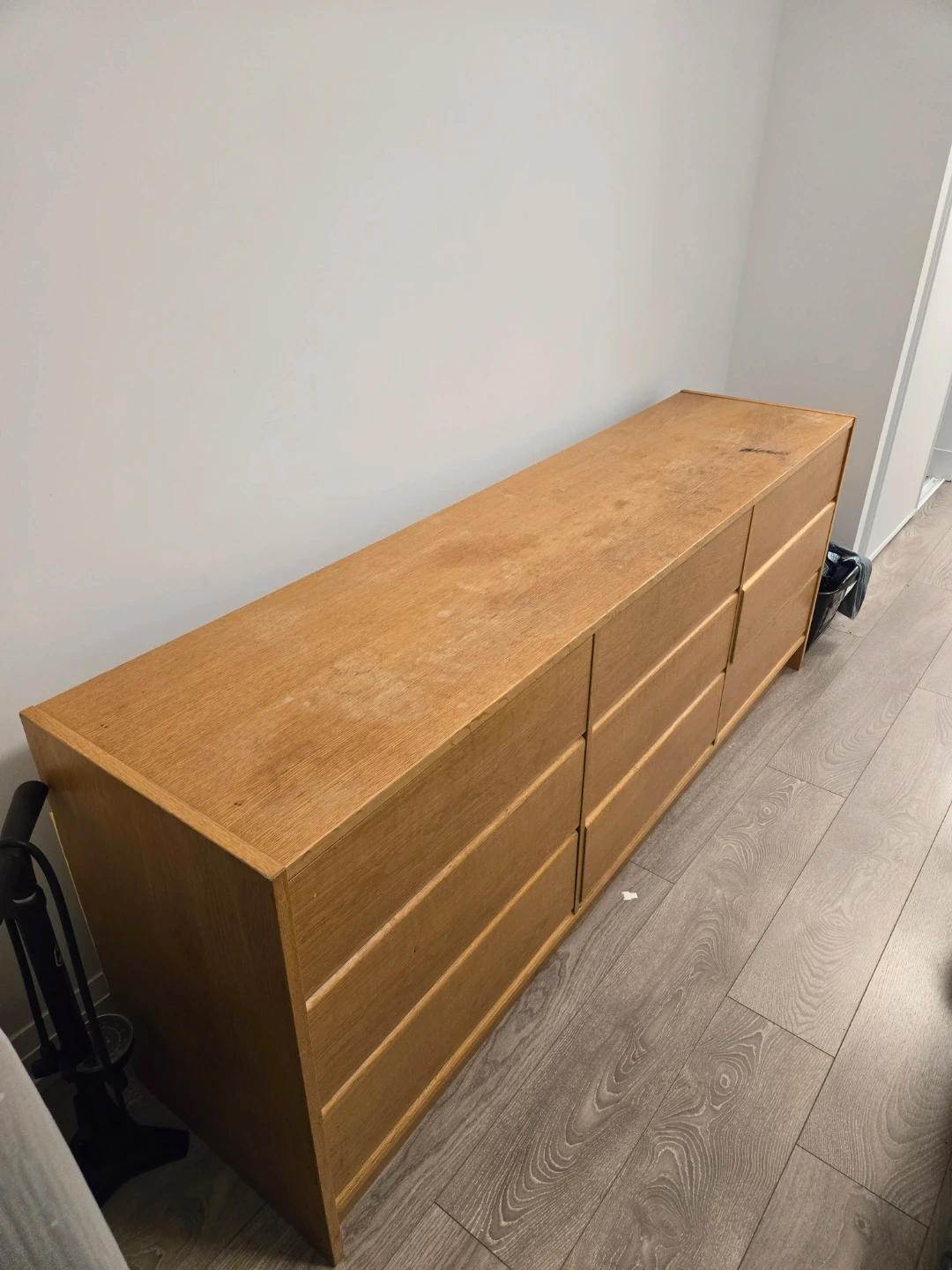 This is a solid oak dresser featuring nine drawers for ample storage. The warm wood finish complements many decors. It's a sturdy piece for organizing clothes or linens.