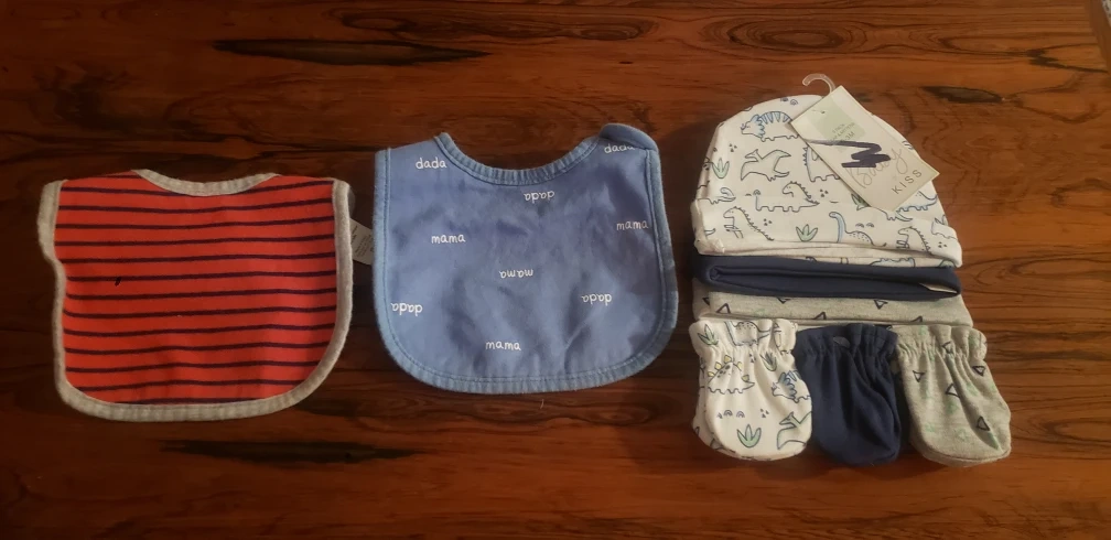 Adorable baby boy clothing bundle. Includes two bibs, one striped and one with 'dada' and 'mama'. Dinosaur-themed hat and mittens set. Perfect for a newborn or young infant.