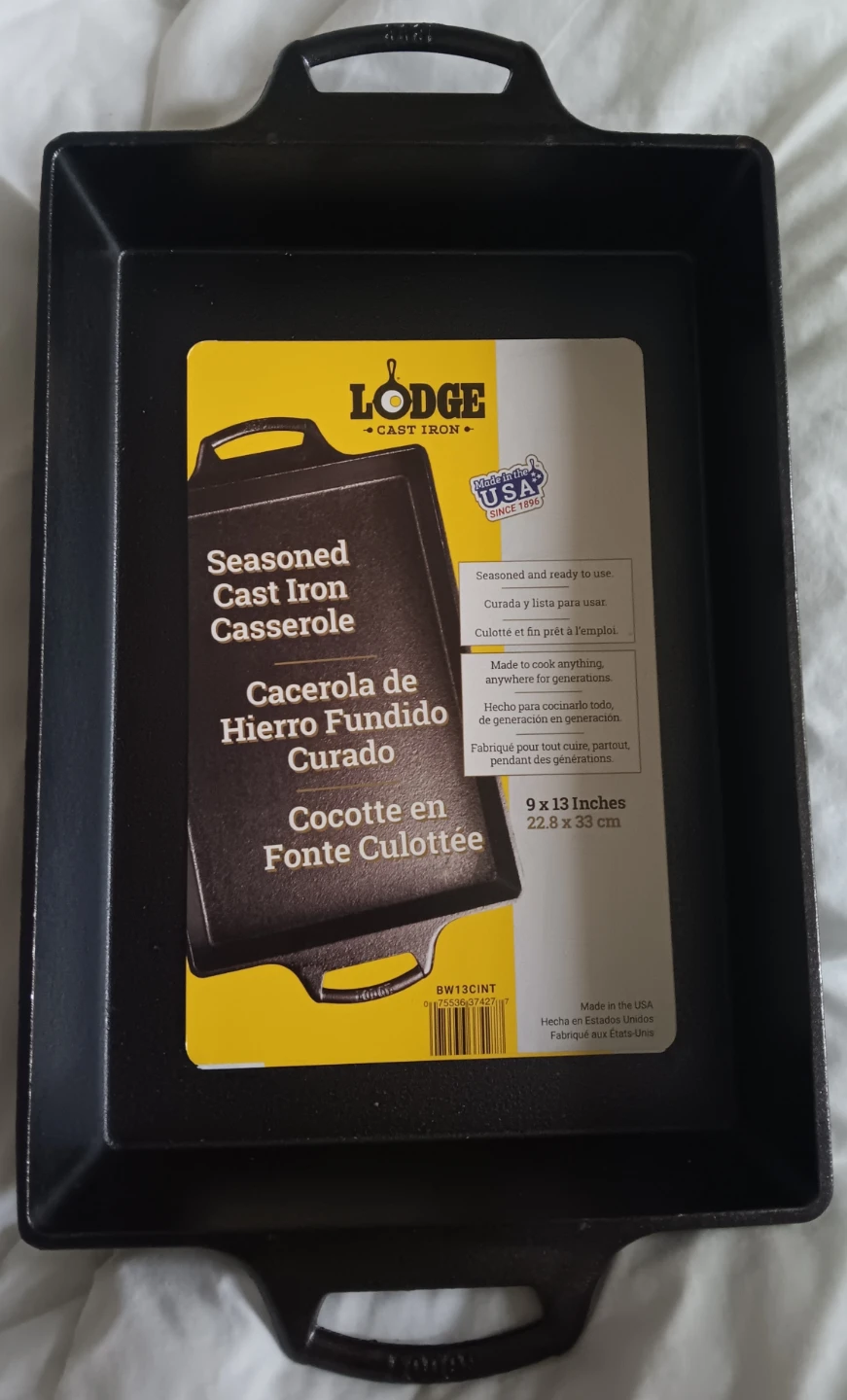 Selling a Lodge seasoned cast iron casserole dish. It's ready to use and made to cook anything, anywhere for generations! The size is 9 x 13 inches (22.8 x 33 cm)