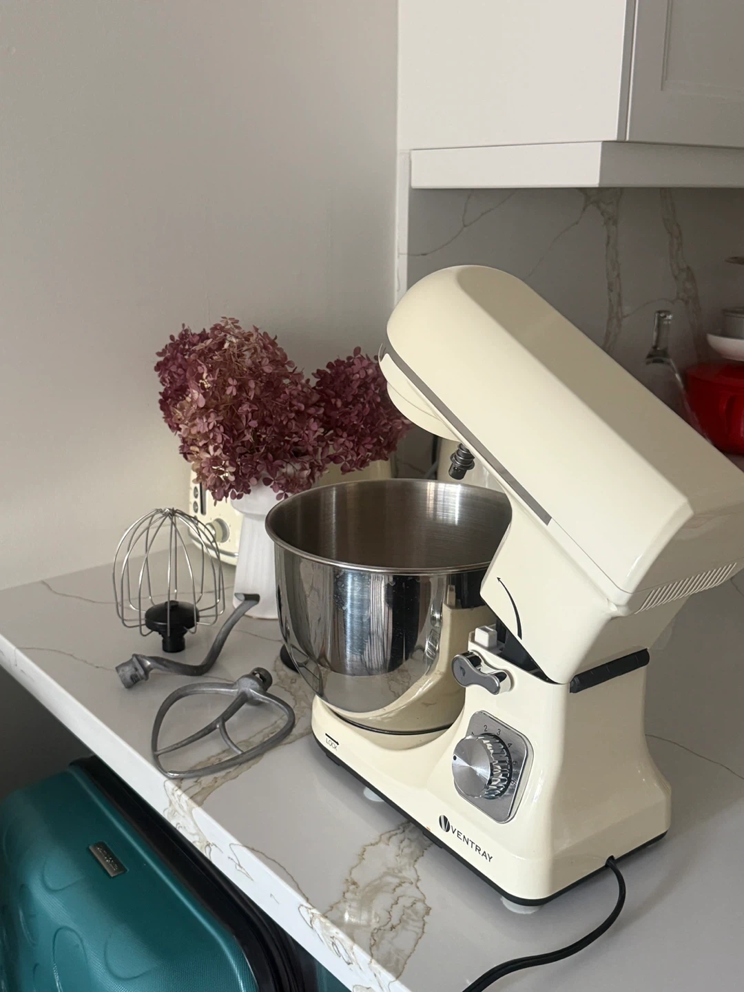 VENTRAY stand mixer in the same cream colour as smeg appliances. It includes a whisk, dough hook, and mixing paddle attachments. This mixer has multiple speed settings and a tilting head design. It's great for various baking needs! Set includes all the attachments and accessories.
