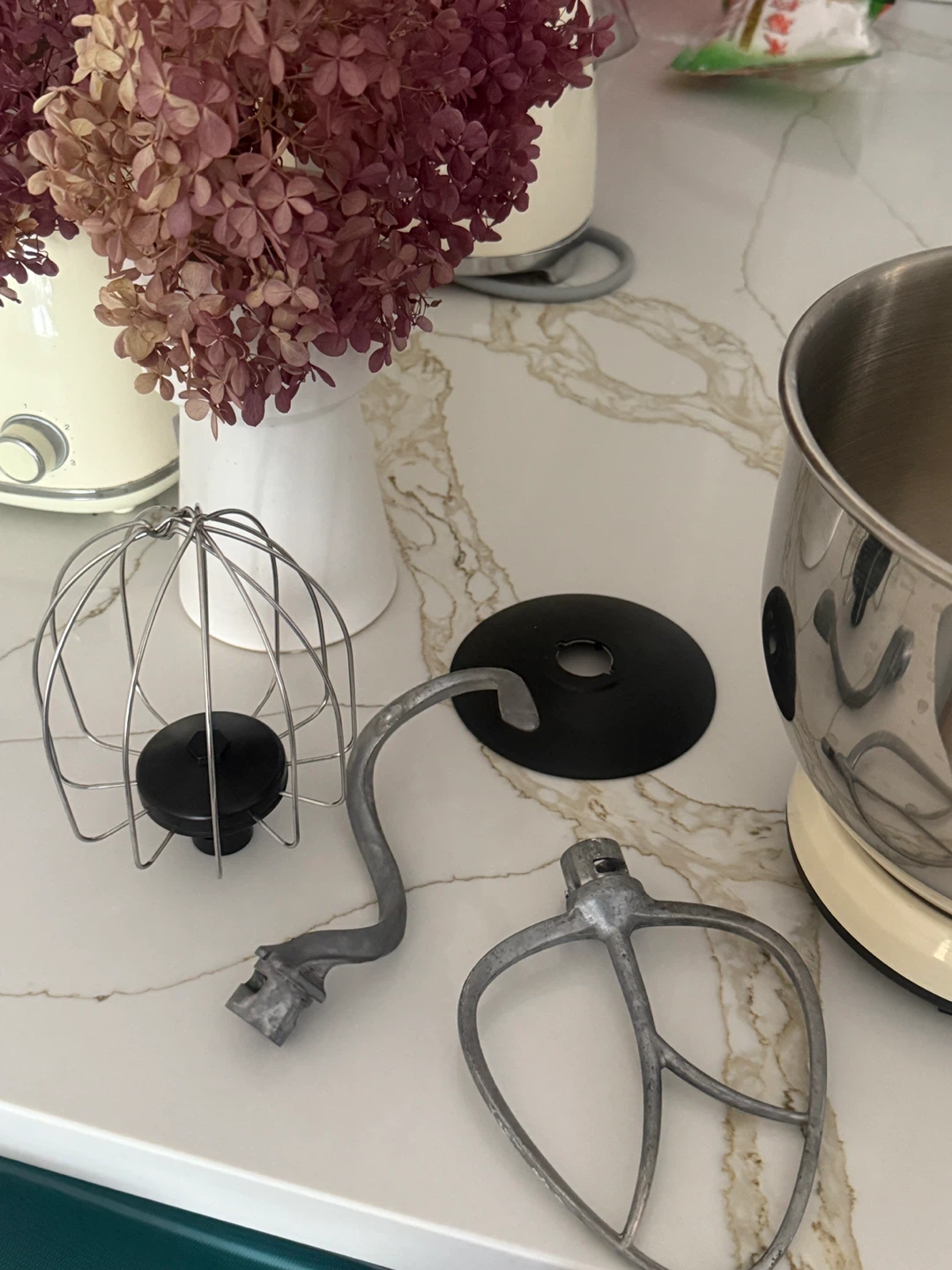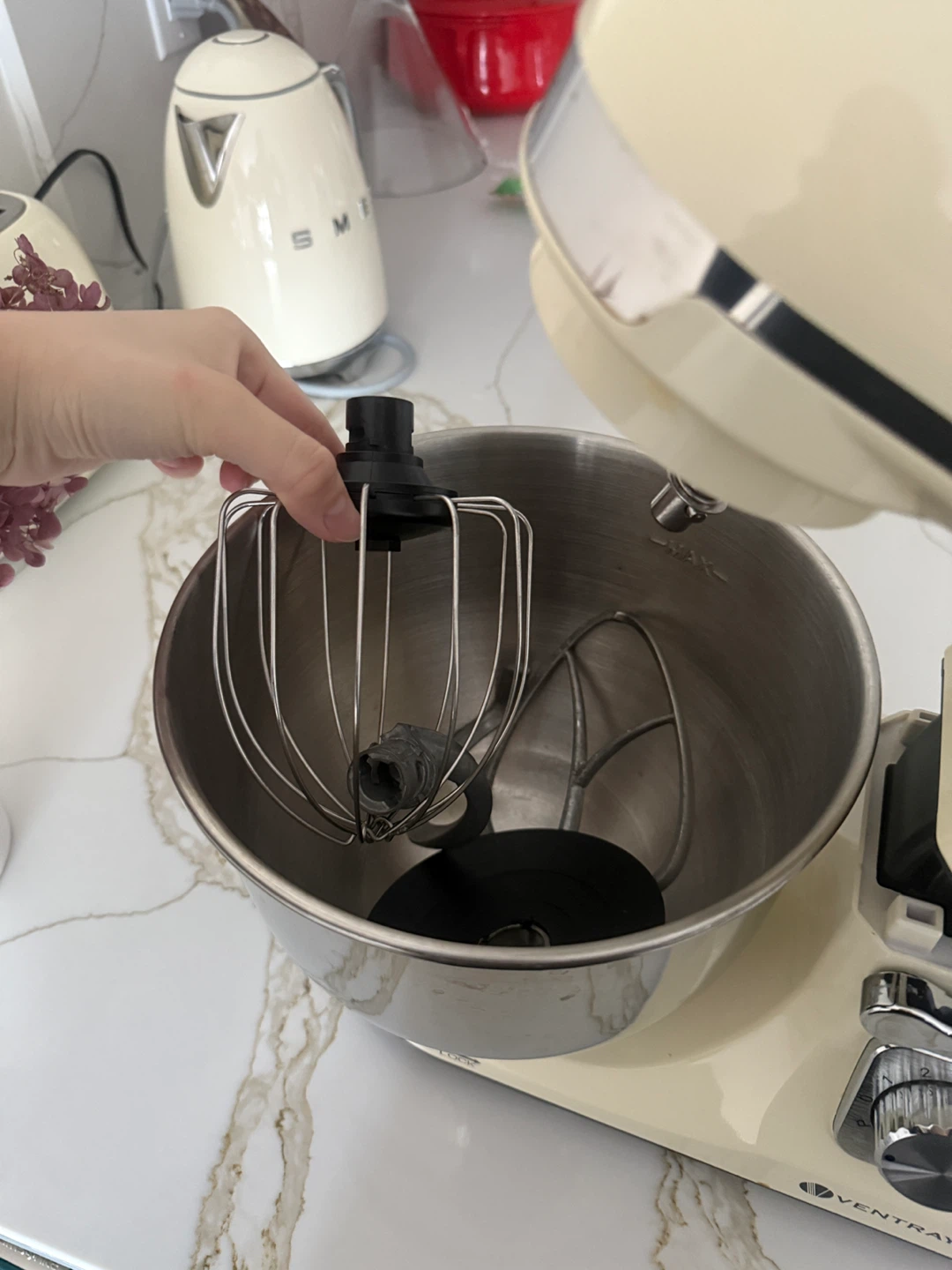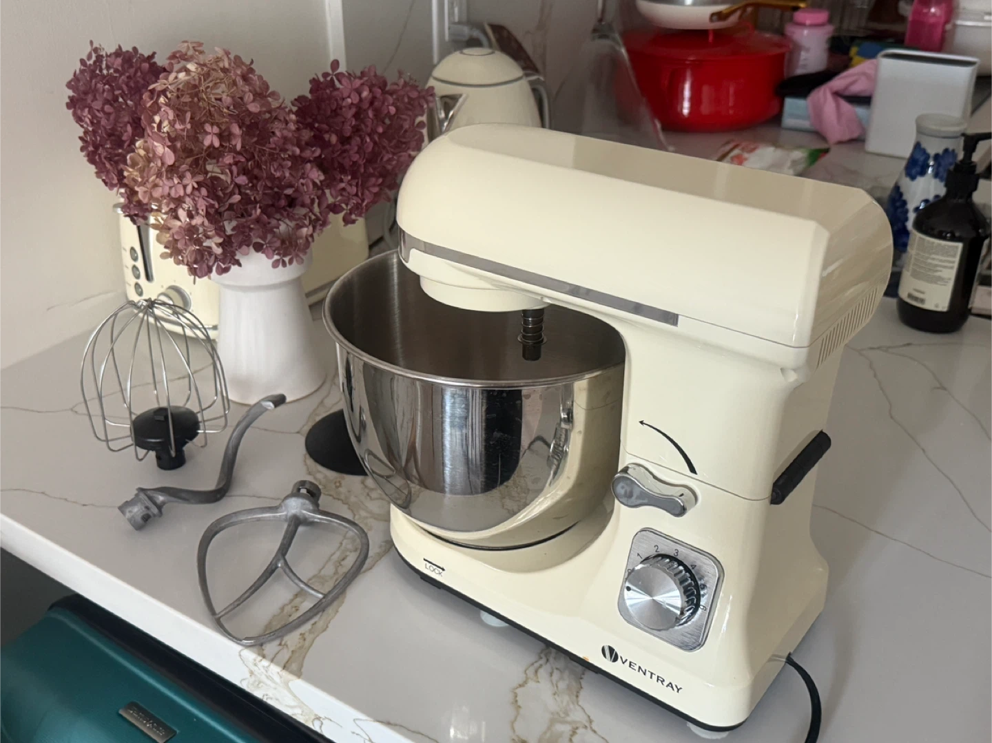 VENTRAY stand mixer in the same cream colour as smeg appliances. It includes a whisk, dough hook, and mixing paddle attachments. This mixer has multiple speed settings and a tilting head design. It's great for various baking needs! Set includes all the attachments and accessories.