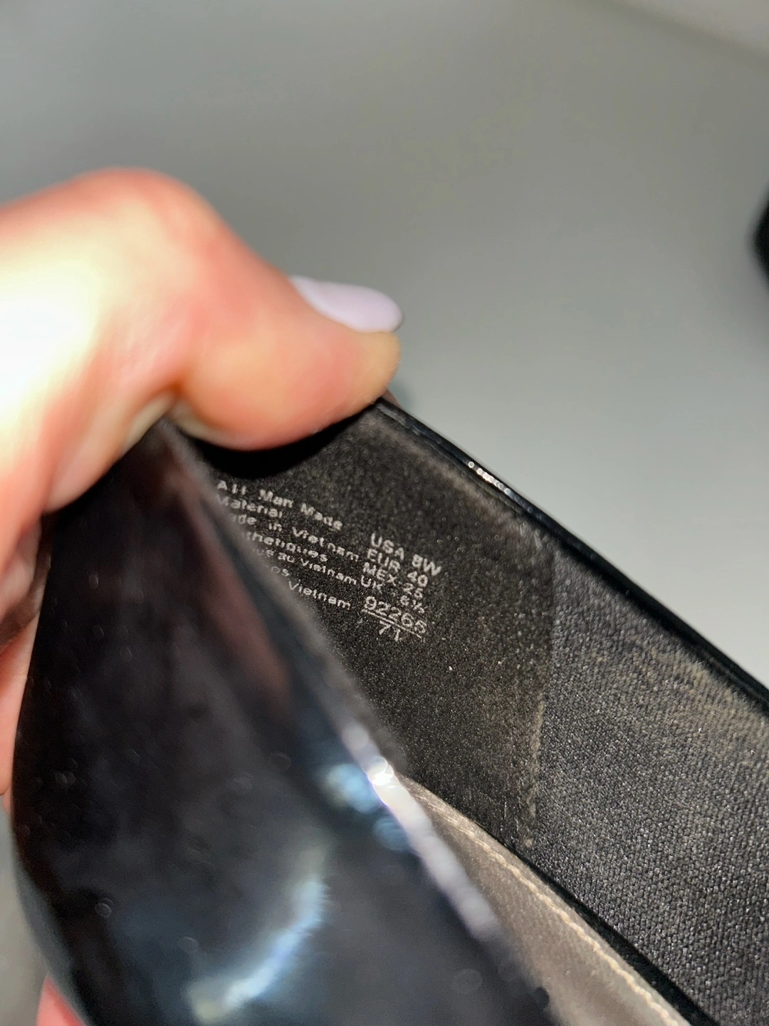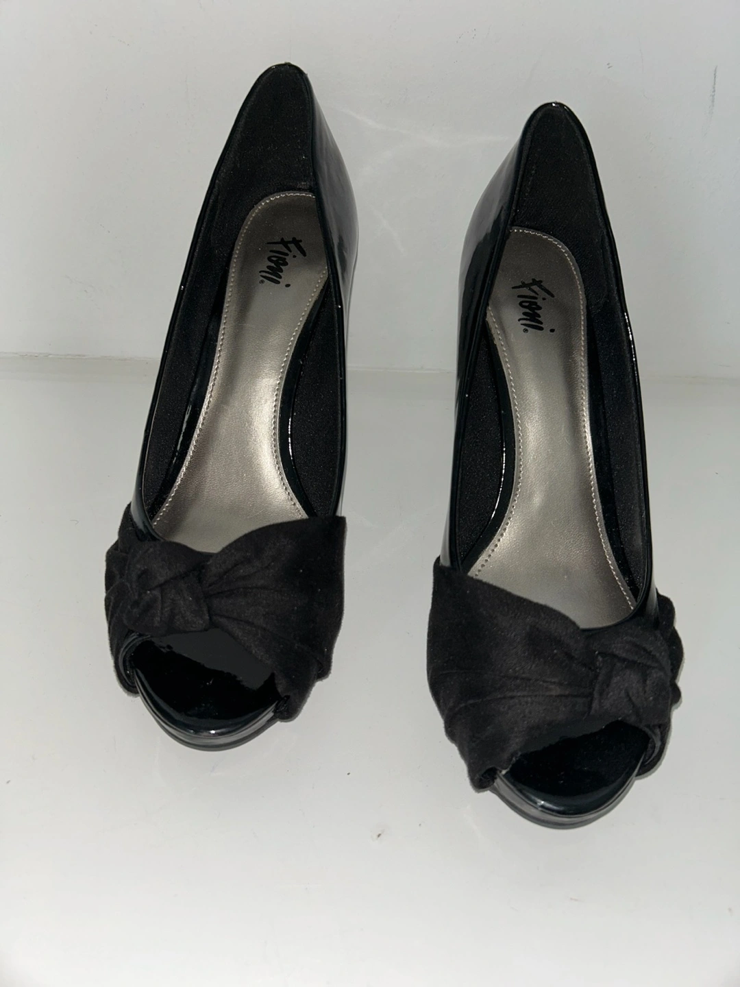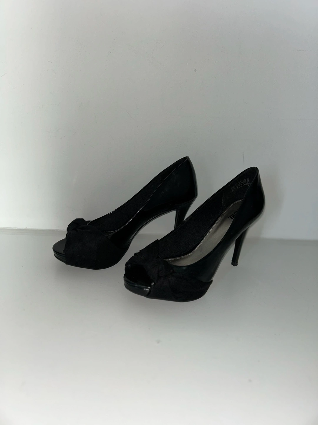 Black high-heeled shoes. Peep-toe design. Feature a bow detail on the front. A great choice for any occasion.