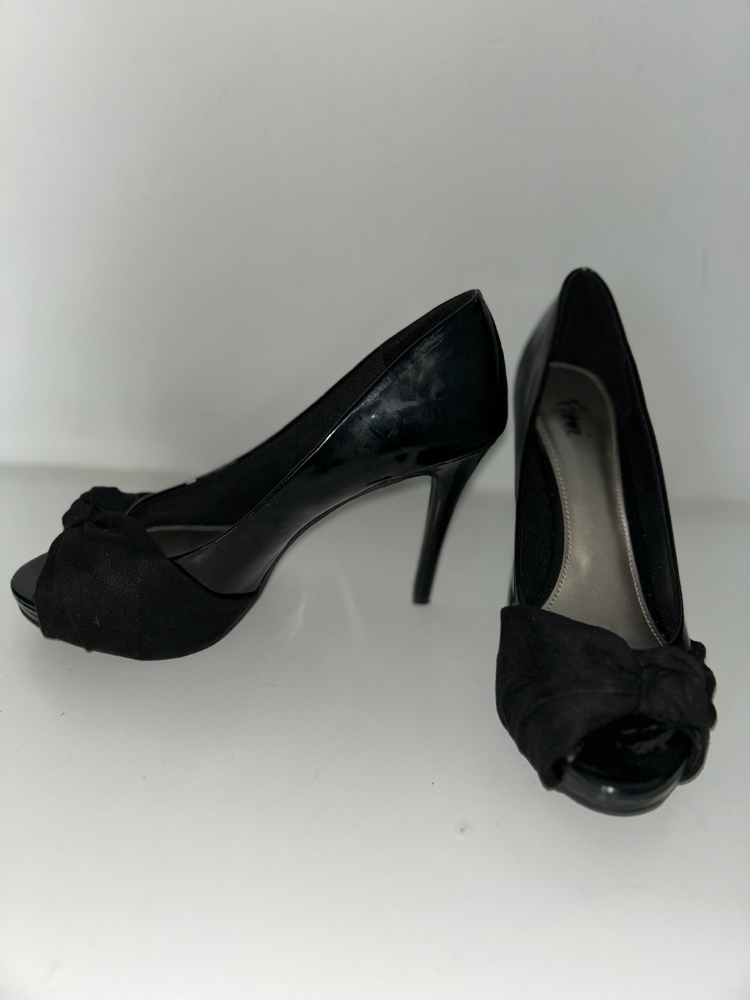 Black high-heeled shoes. Peep-toe design. Feature a bow detail on the front. A great choice for any occasion.