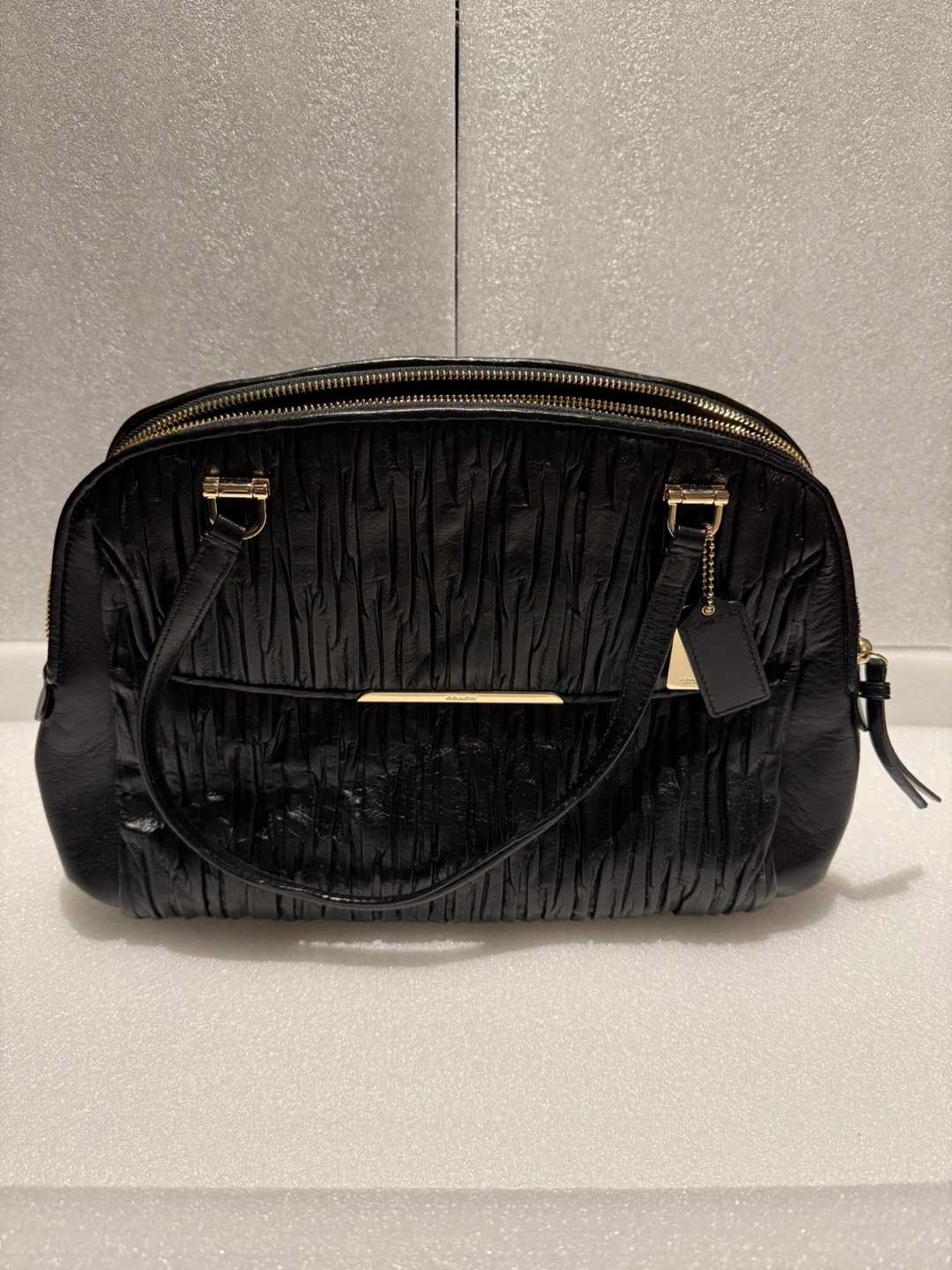Black leather handbag. Double zippers. Two top handles and a shoulder strap. Interior has multiple compartments. Plated hardware. Gold Coach tag.