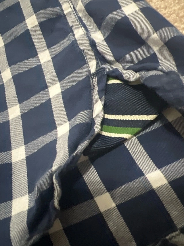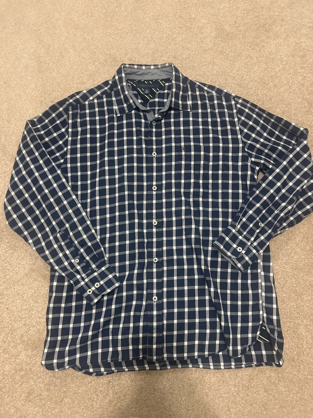 This is a Tommy Hilfiger button-down shirt, size large, featuring a stylish blue and white checkered pattern, perfect for casual or semi-formal wear. Being a gently worn item, it's in good condition, ready to add a touch of classic style to your wardrobe. Key Features: - Brand: Tommy Hilfiger - Size: Large - Colour: Blue and White Checkered - Style: Button-Down