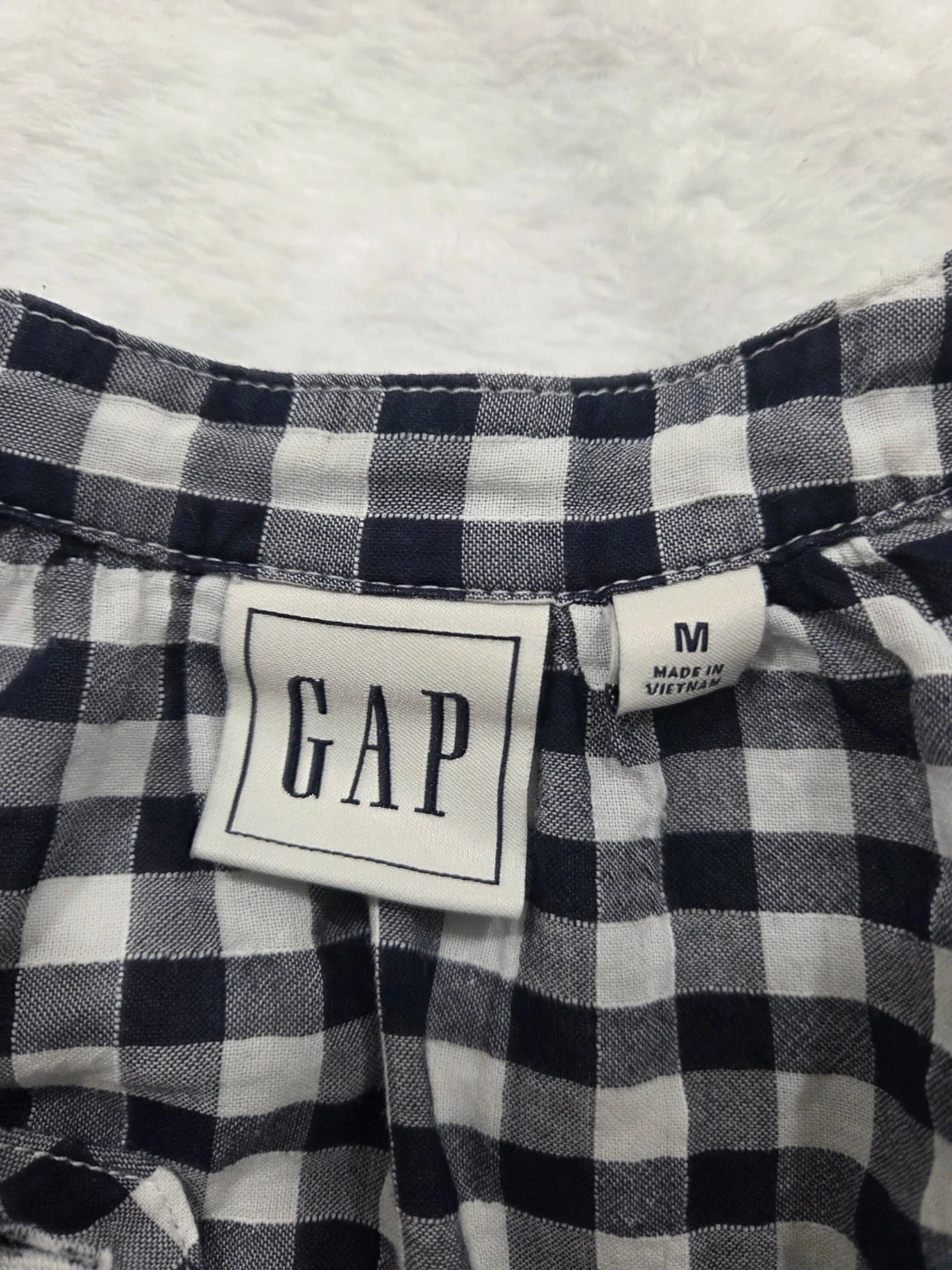 This is a Gap women's blouse in size medium. It features a classic navy and white gingham pattern. The sleeves have adjustable tie details.