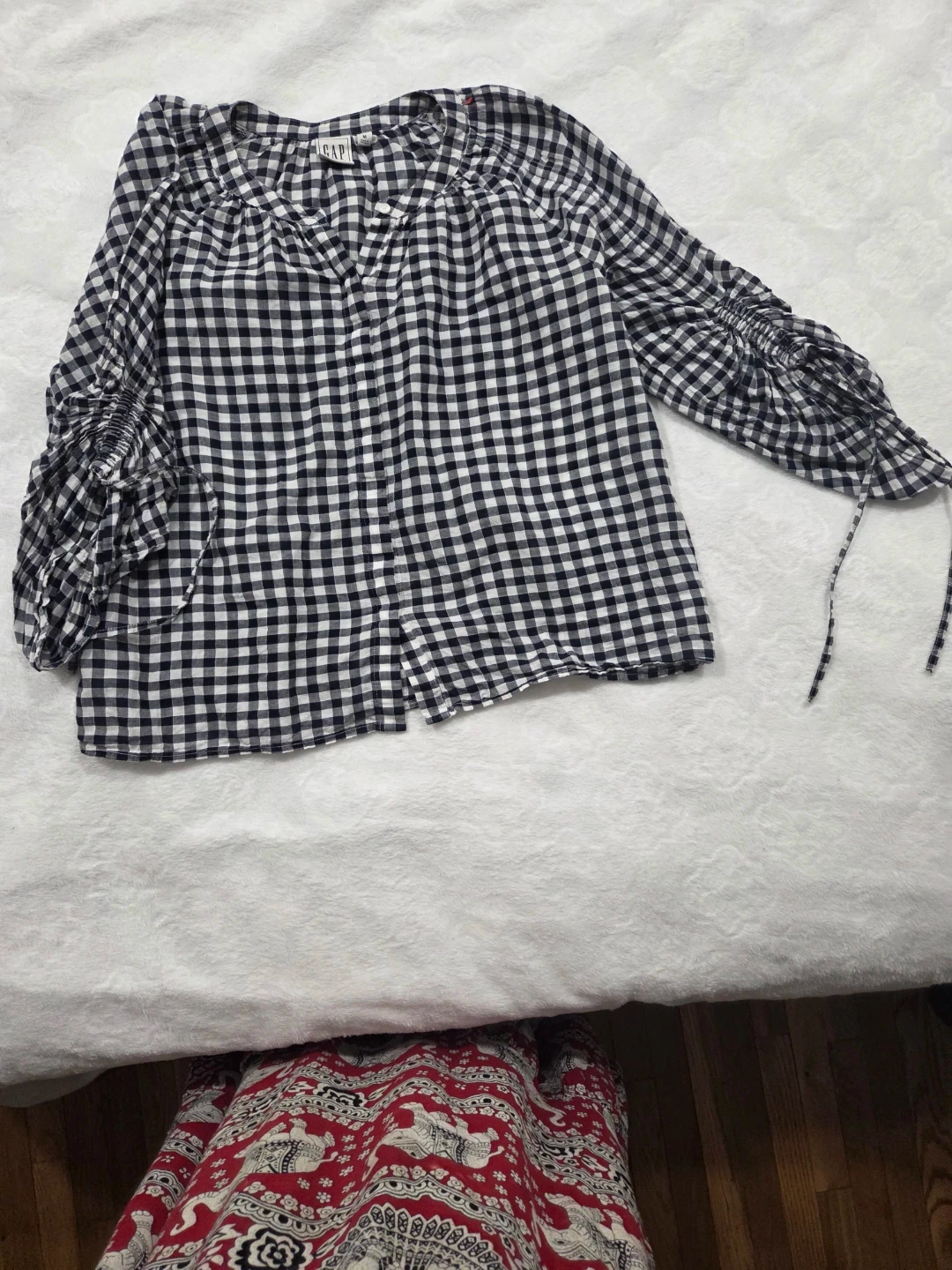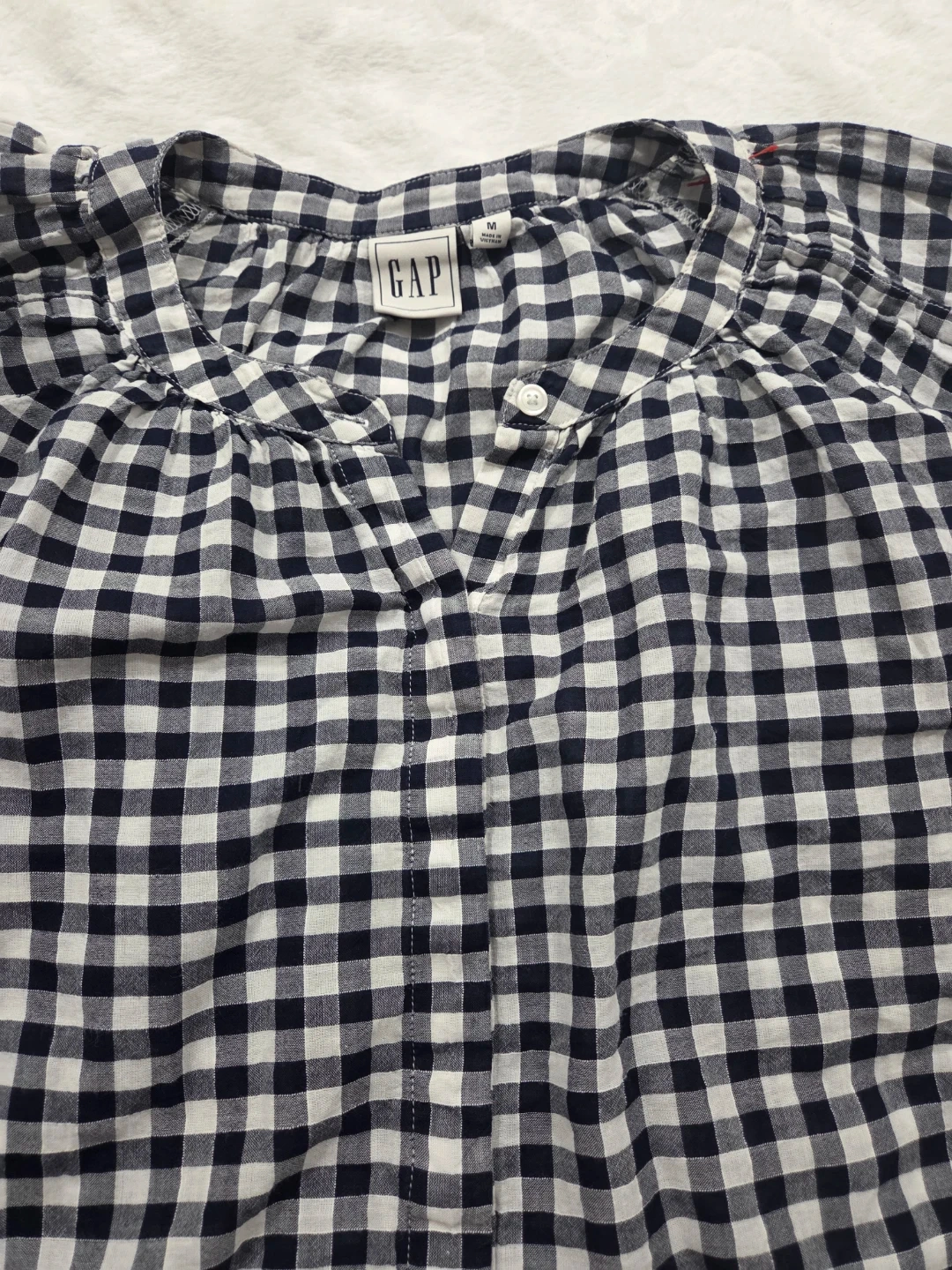 This is a Gap women's blouse in size medium. It features a classic navy and white gingham pattern. The sleeves have adjustable tie details.