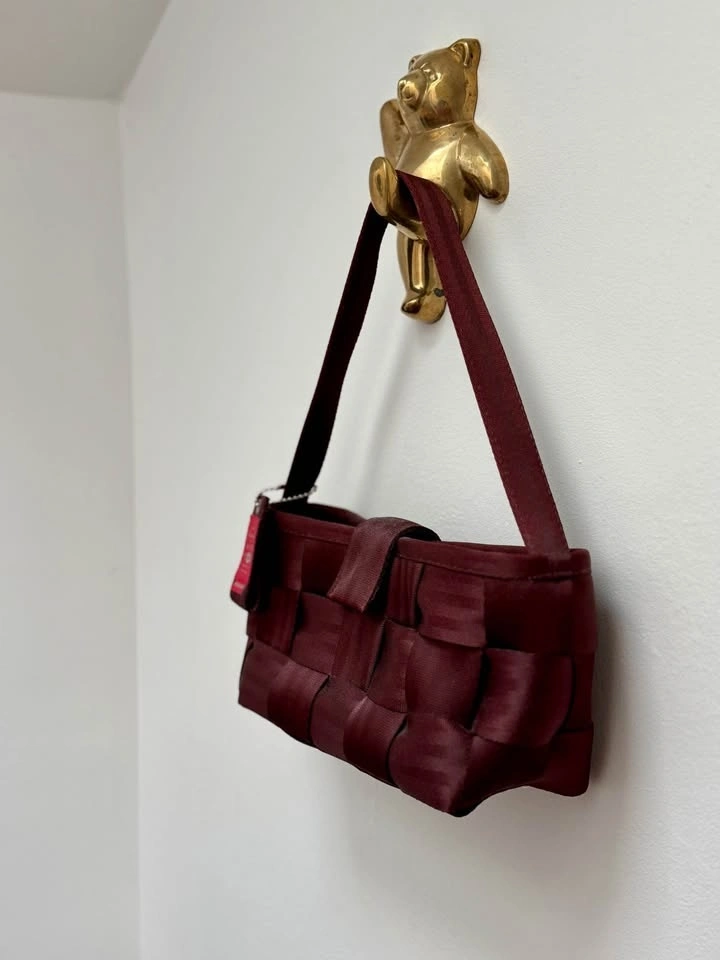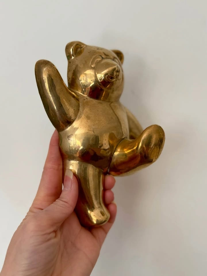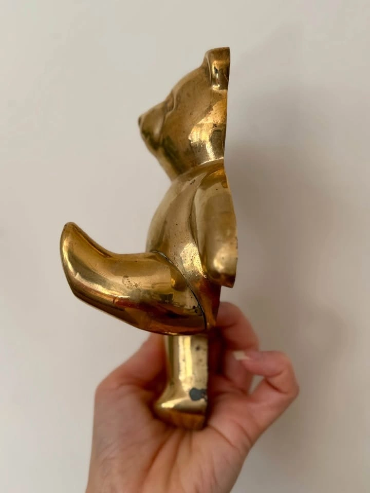 Solid brass panda / teddy bear wall hook. This whimsical piece features a waving panda with a high-shine finish and a natural patina. Perfect for a nursery, kid's room, or as a unique entryway accent for keys and light jackets.