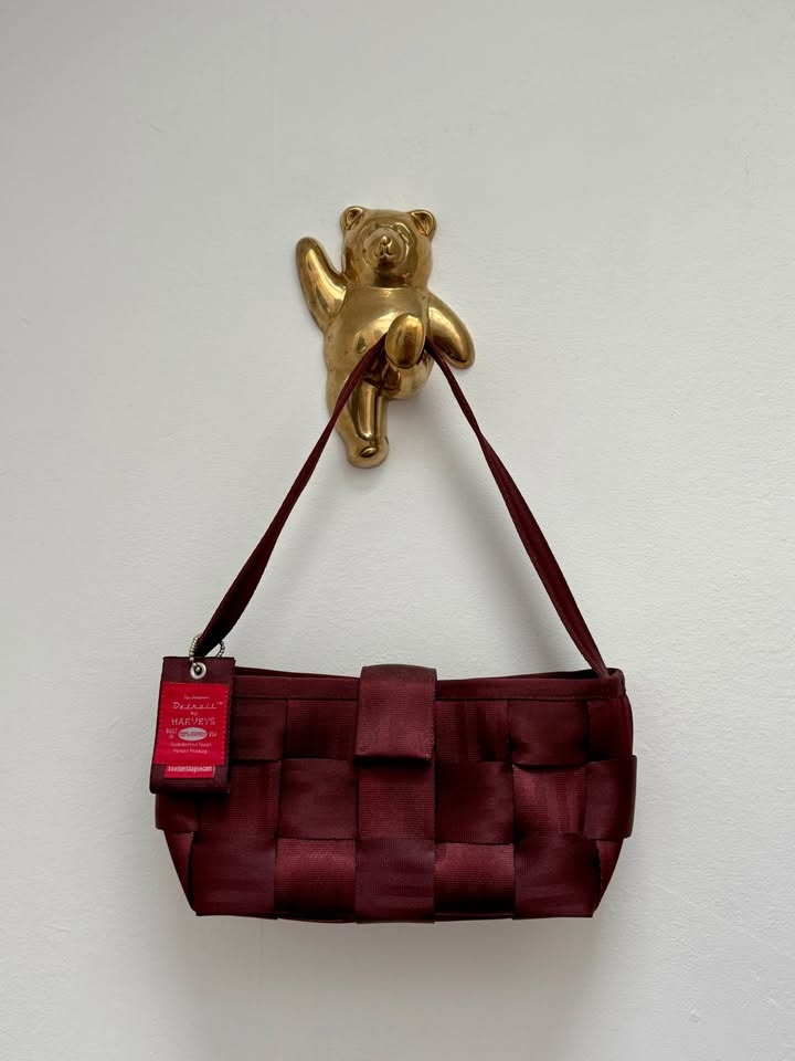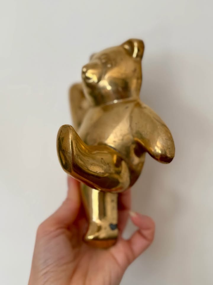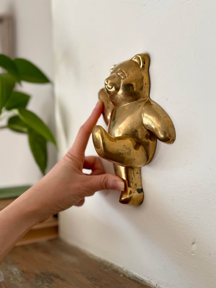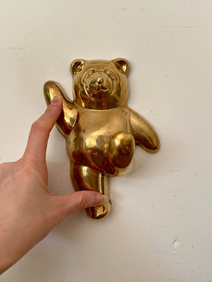 Solid brass panda / teddy bear wall hook. This whimsical piece features a waving panda with a high-shine finish and a natural patina. Perfect for a nursery, kid's room, or as a unique entryway accent for keys and light jackets.