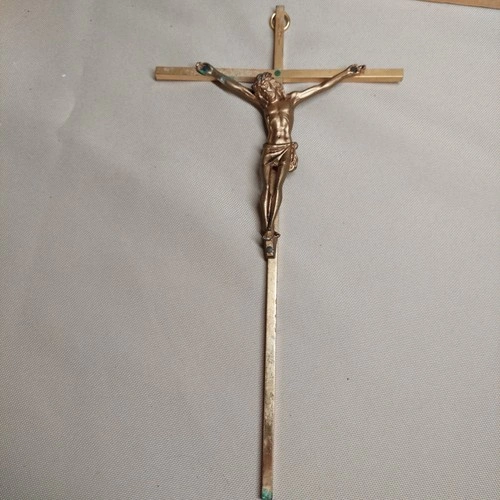 Beautiful vintage crucifix wall cross featuring a detailed cast figure of Jesus Christ (corpus) mounted on a slim, minimalist metal cross. The corpus displays strong classical styling with well-defined anatomy and flowing drapery, giving the piece a reverent and traditional appearance.