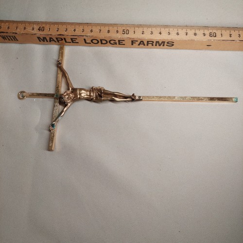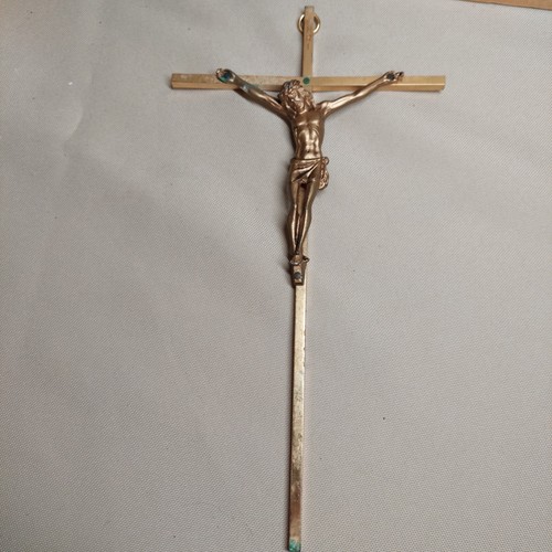 Beautiful vintage crucifix wall cross featuring a detailed cast figure of Jesus Christ (corpus) mounted on a slim, minimalist metal cross. The corpus displays strong classical styling with well-defined anatomy and flowing drapery, giving the piece a reverent and traditional appearance.