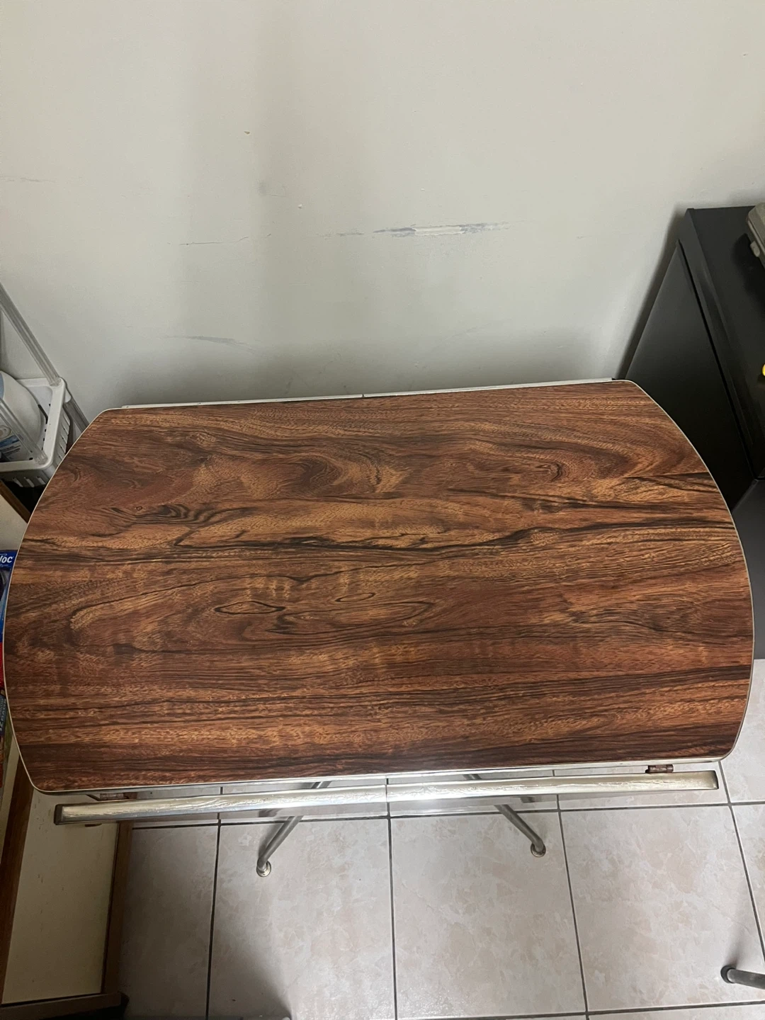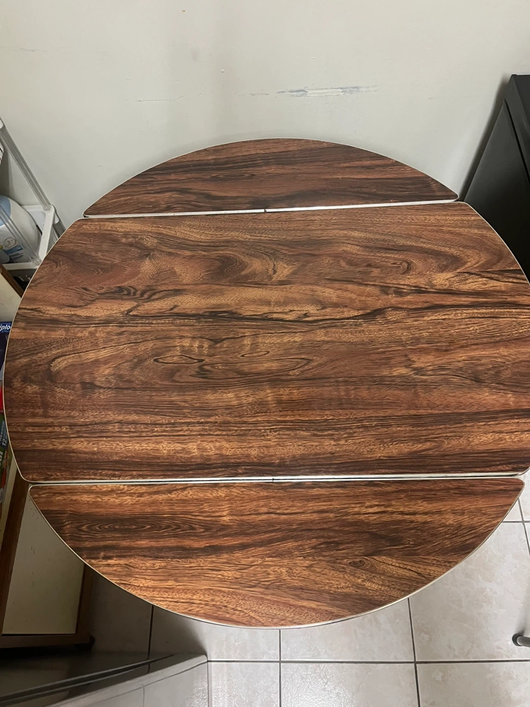 Firm $40 Pickup only 🚘 Prices are Firm💲 Serious inquiries only 🙏 Final sale / Cash payment 💵 Item sold “as is” final sale SERIOUS BUYERS ONLY/ Final sale/ cash payment/ No holds items will be sold on a FIRST- COME & Payment first basis! This dining table features a wood-look top with a chrome edge and a central pedestal base. It's a drop-leaf style, offering flexible space. Ideal for smaller dining areas or kitchens! Dimensions with the sides down 36x20 and with it extended out 36x36