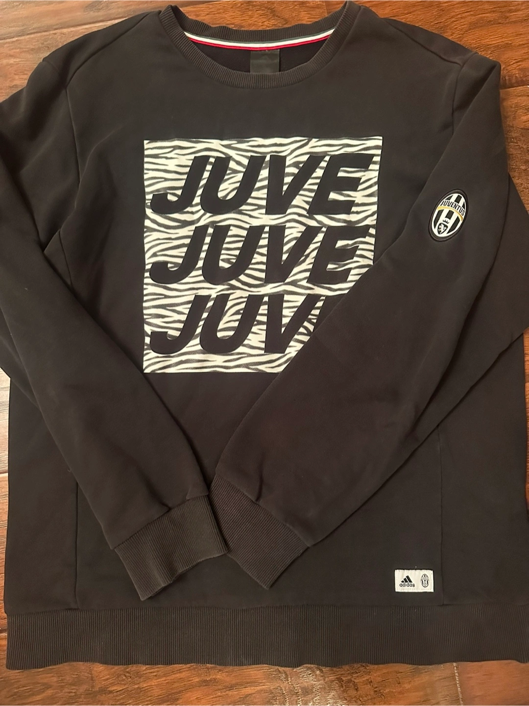 Selling an Adidas Juventus sweatshirt in black. The front has a Juve design, and the Juventus logo is on the sleeve. A great piece for any fan!