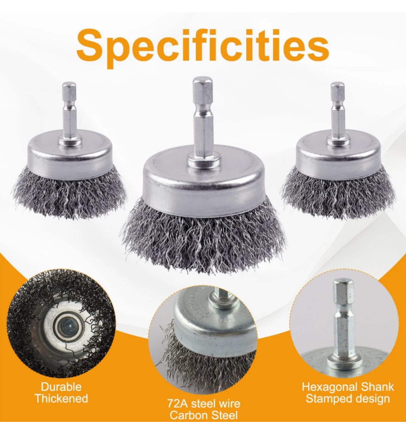 Get your cleaning and polishing done with this handy wire wheel brush set! Perfect for drills, these brushes are made with durable 72A steel wire and feature a precision 1/4" shank. The product size is 2"/50mm. Great for removing rust and grime!