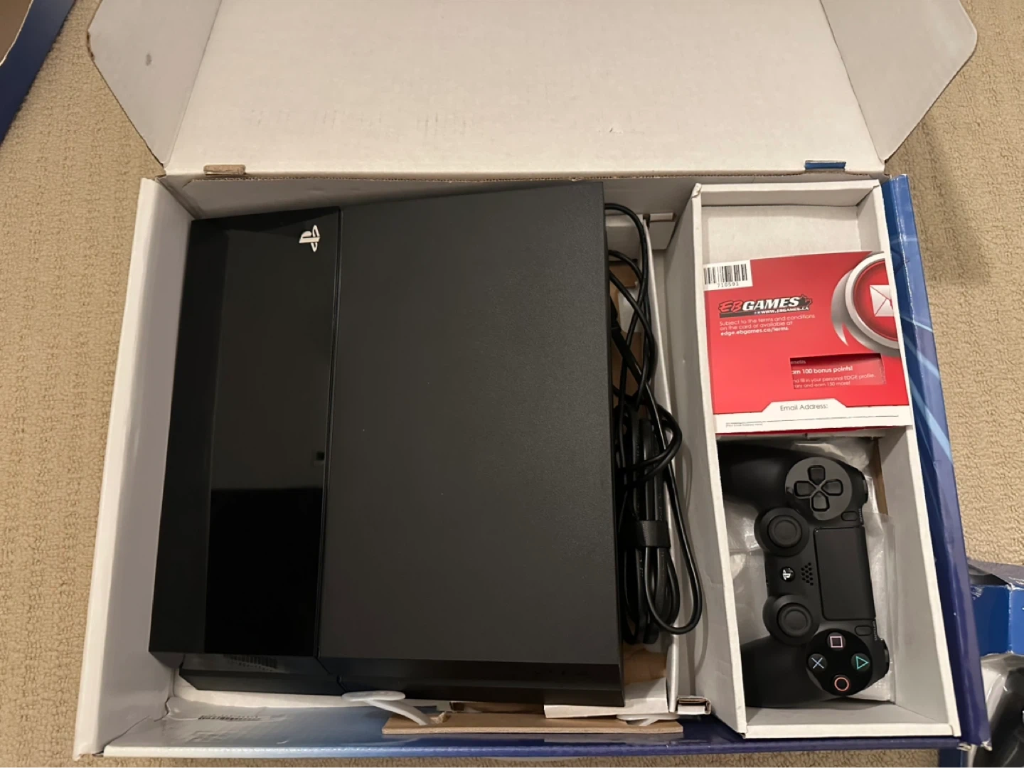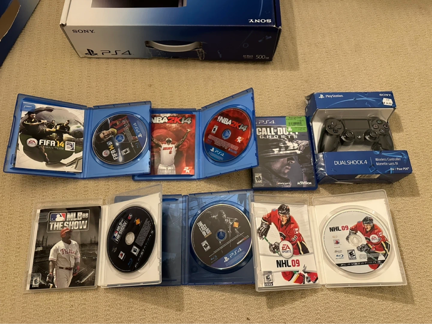Includes a black 500GB PS4 console, two DualShock controller, and several games. Games included are MLB, NHL 09, FIFA 14, NBA 2K14, and Call of Duty Ghosts.