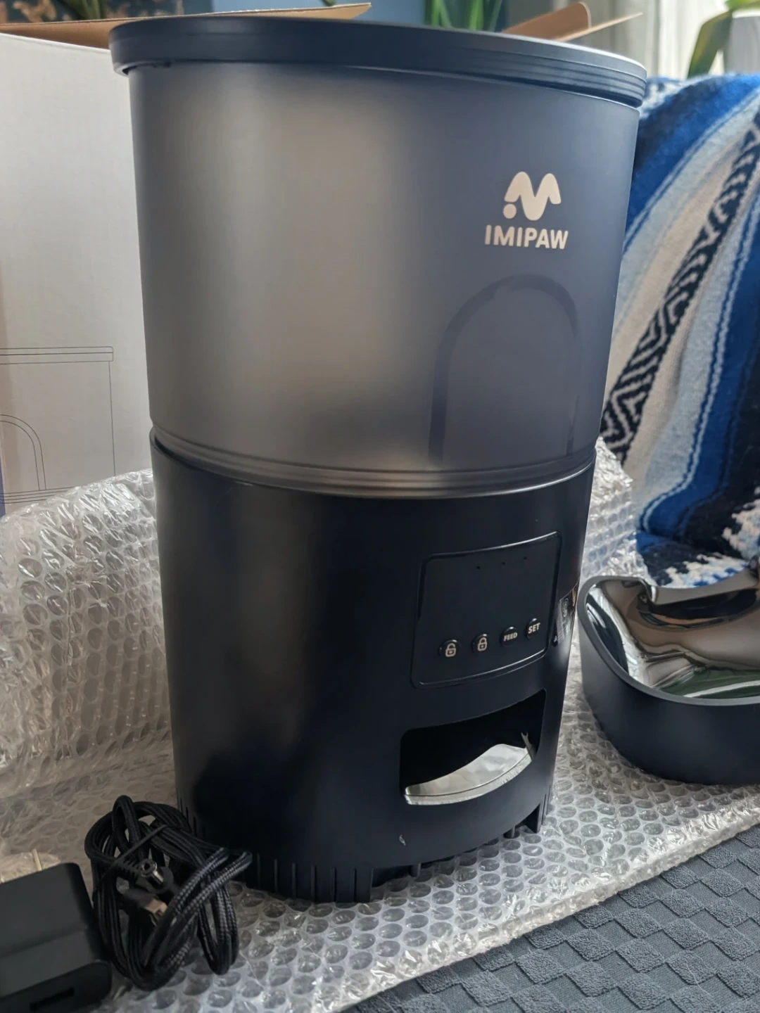 Brand new IMIPAW automatic pet feeder with a 3L capacity. It's suitable for cats and small or medium dogs. The feeder comes with a power adapter and is designed for portion-controlled feeding.