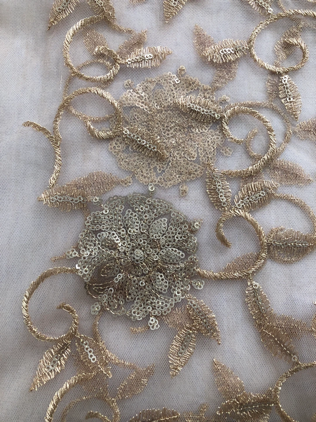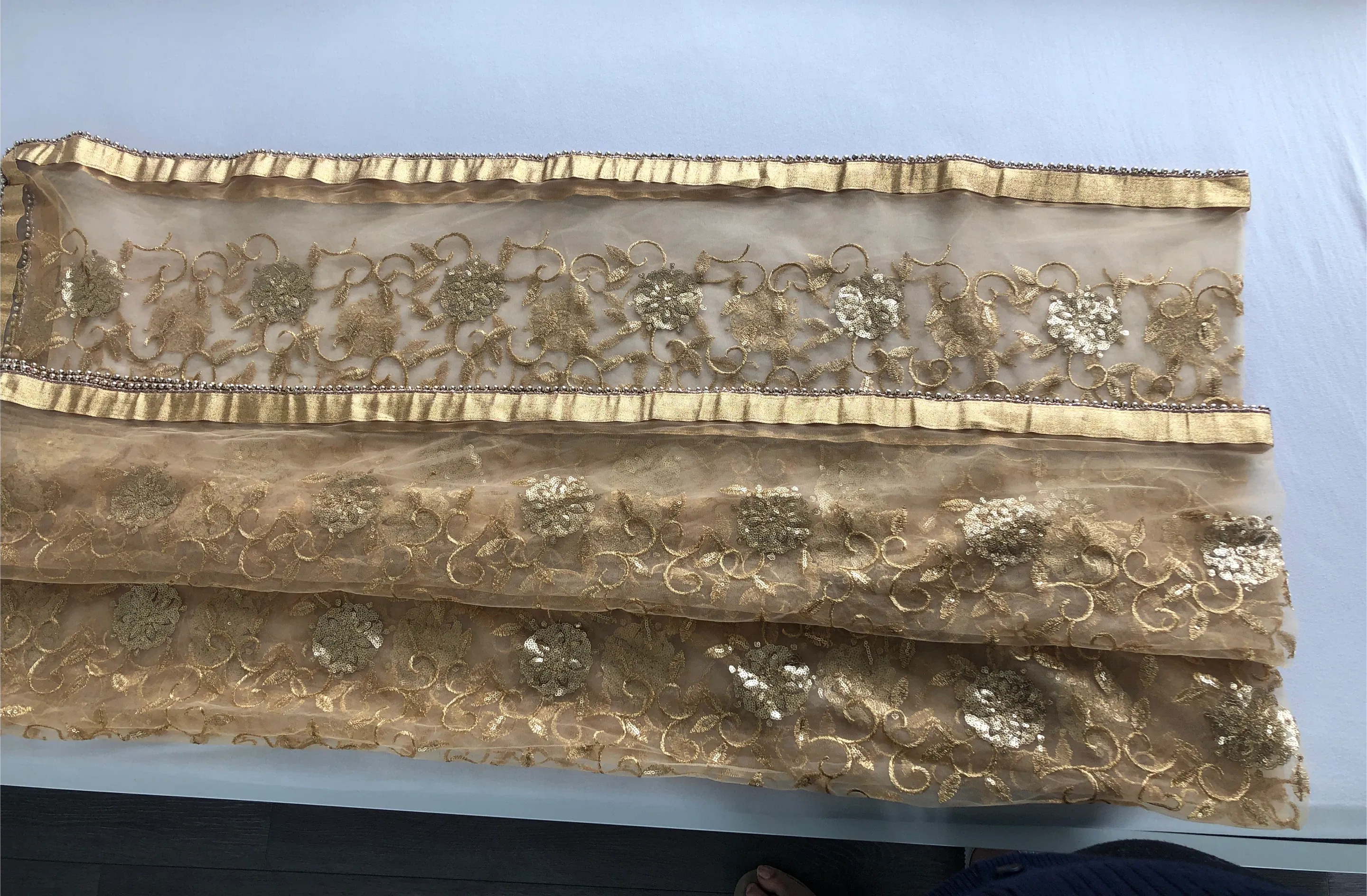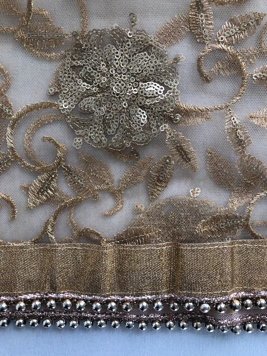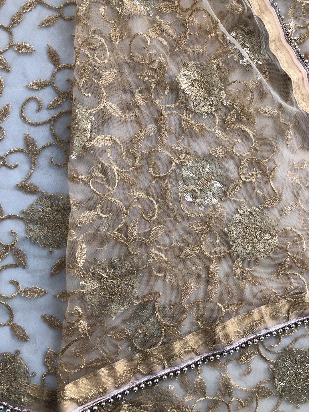 Sheer gold net dupatta with intricate floral embroidery and scattered sequins. It features a decorative gold trim with beaded detailing along the edges. Perfect for adding a touch of elegance to an outfit!