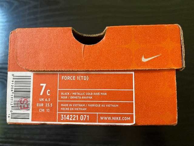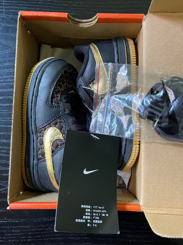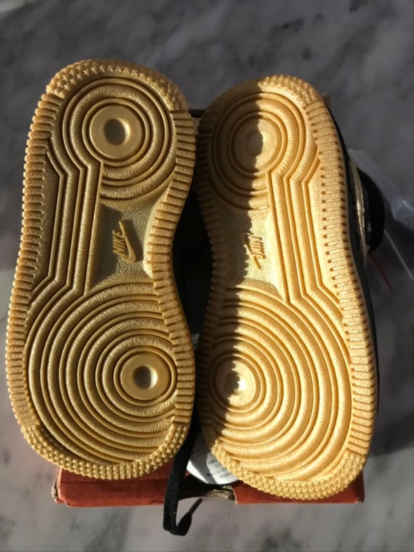 Authentic Nike shoes for toddler boys or girls in size US 7. Very fashionable—black with gold soles! Brand new in box with tags. Originally purchased in Japan. Pickup at Davisville station.