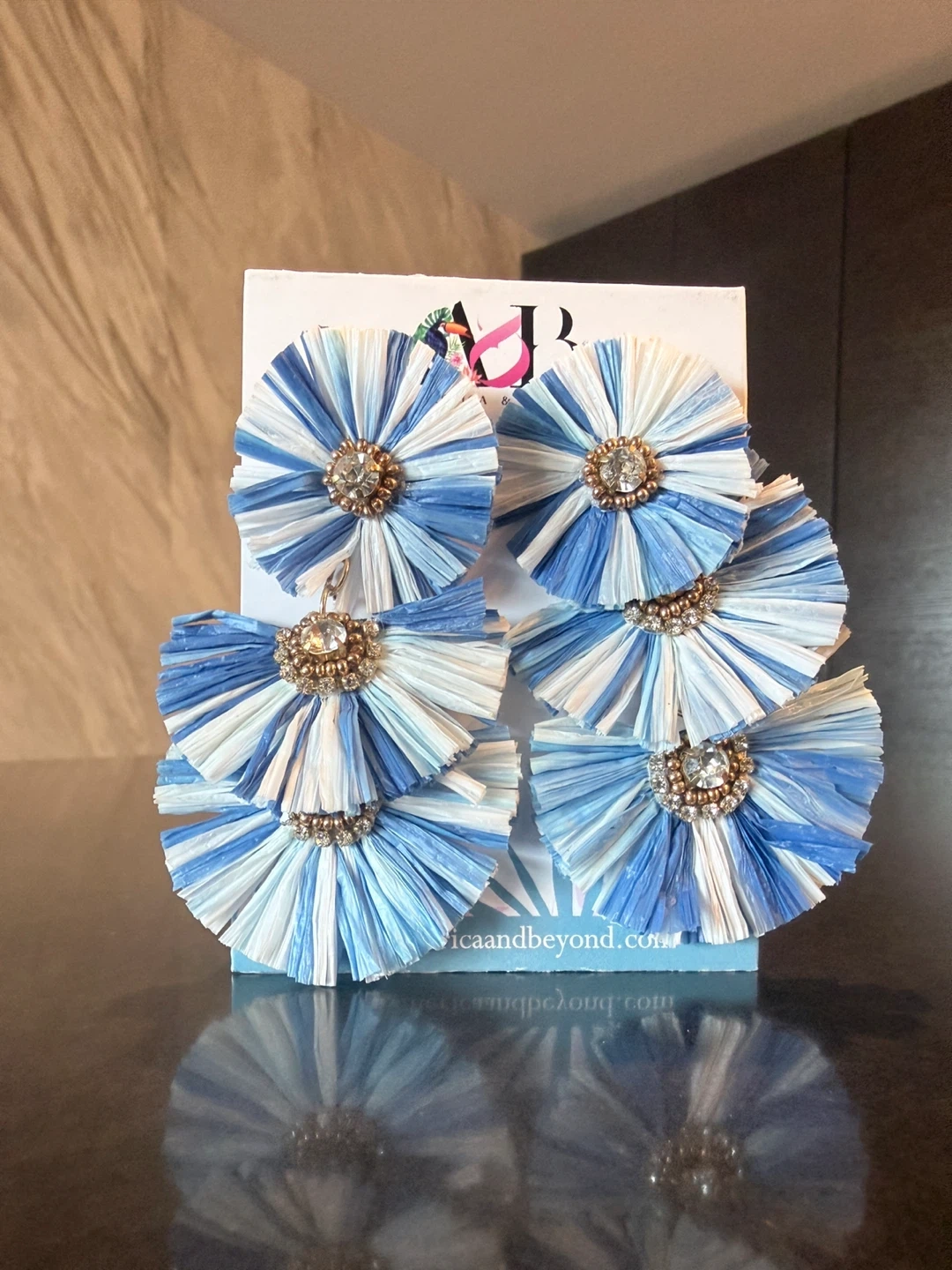 These are indigo dip dyed raffia earrings. They are approximately 3.5 inches long and 1.5 inches wide. The raffia is a mix of white and blue.