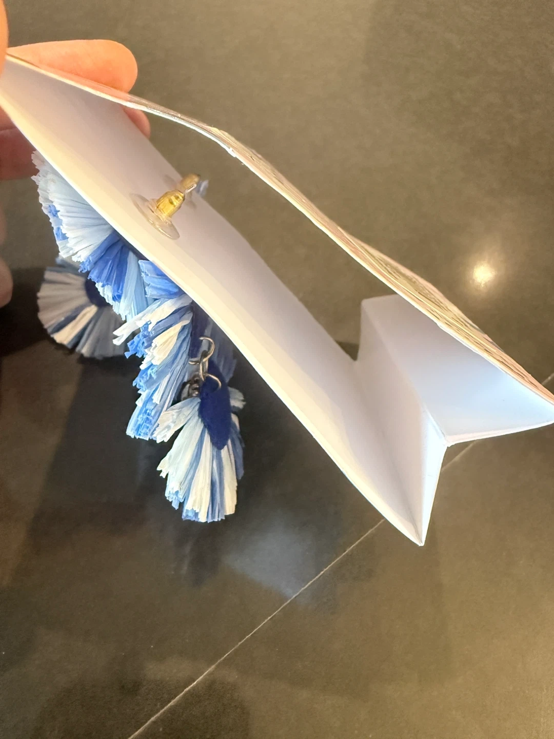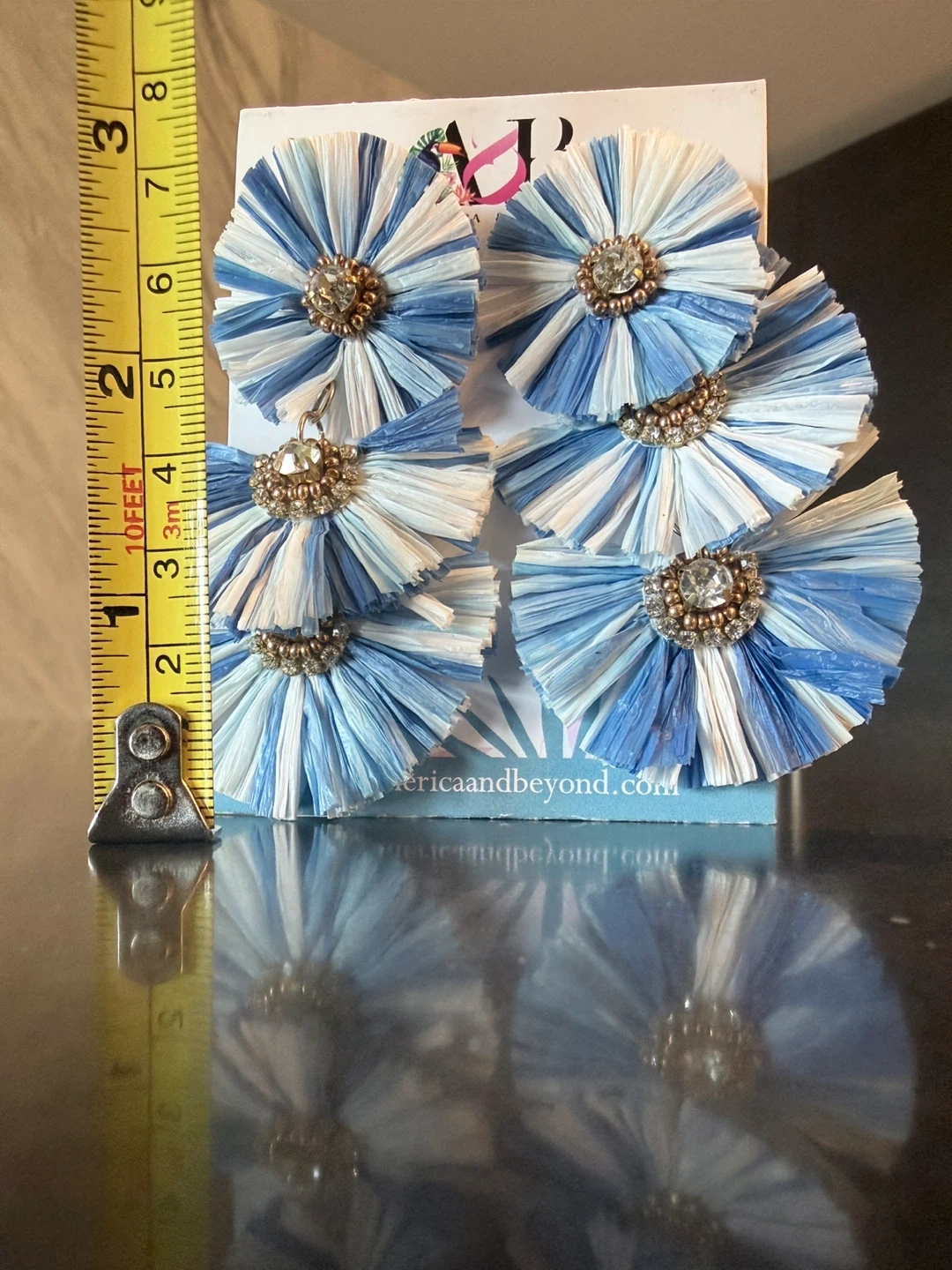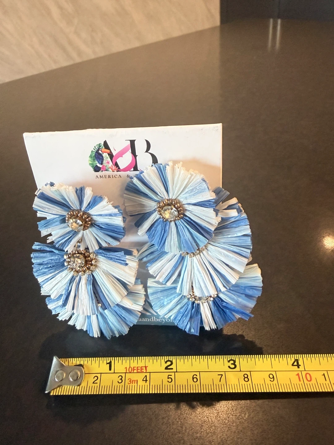These are indigo dip dyed raffia earrings. They are approximately 3.5 inches long and 1.5 inches wide. The raffia is a mix of white and blue.