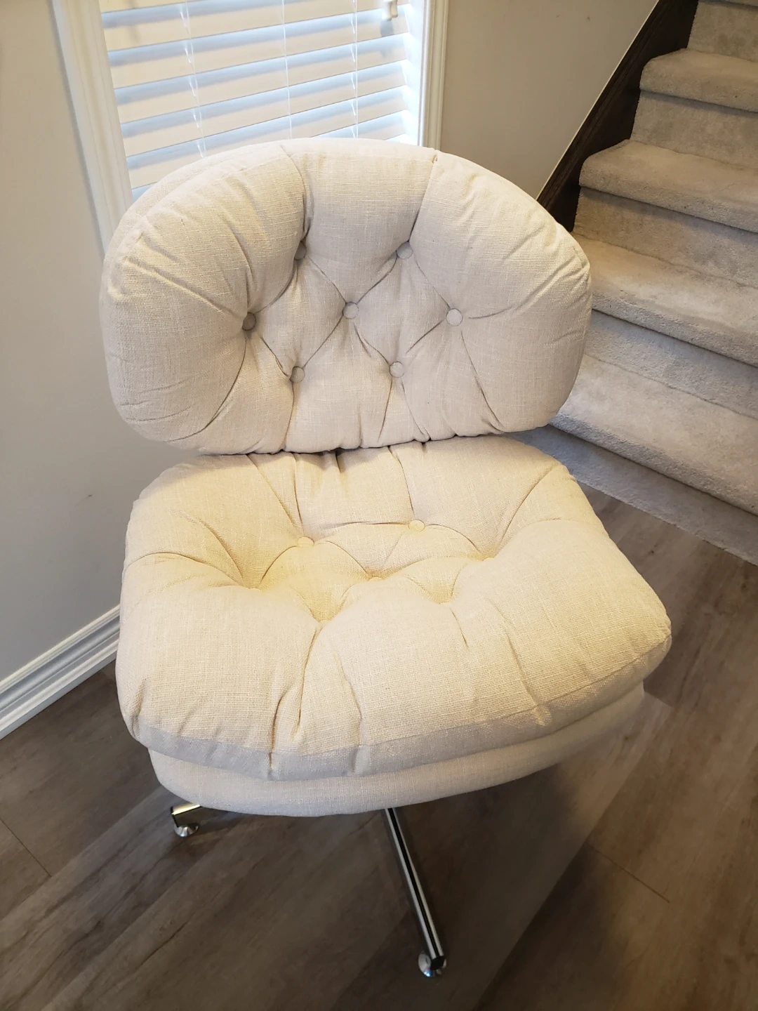 This is a tufted accent chair. It's upholstered in a textured, light-coloured fabric. The chair has a swivel base with a gas lift for adjustable height. Dimensions: 24.8" (width) x 18.5" (depth) x 37" (height).