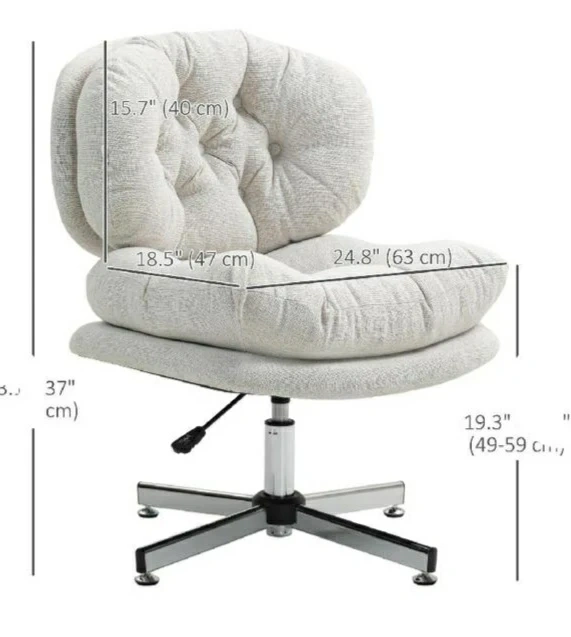 This is a tufted accent chair. It's upholstered in a textured, light-coloured fabric. The chair has a swivel base with a gas lift for adjustable height. Dimensions: 24.8" (width) x 18.5" (depth) x 37" (height).
