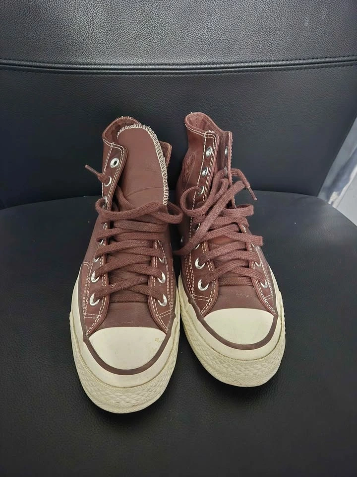 Converse Chuck 70 high-top sneakers in a brown or "barkroot" leather finish. Unisex Size 7 for Men, Size 9 for Women. EU 40. Pick up only.