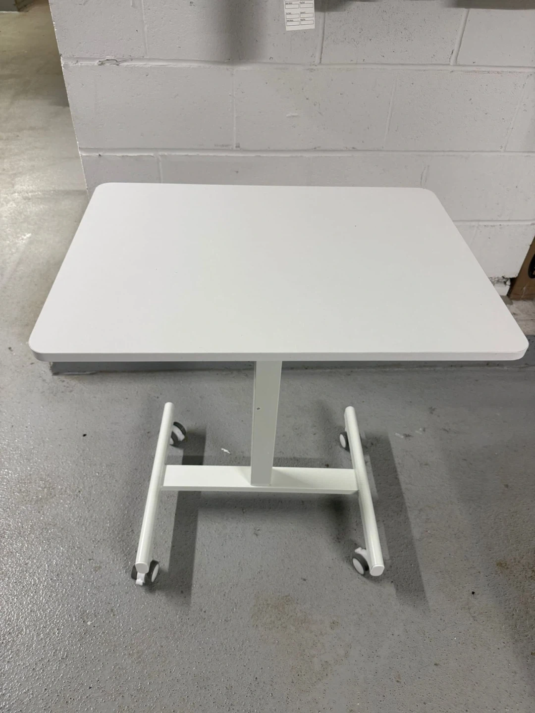 A white rolling table with a height-adjustable feature. It has a sturdy base with wheels for easy mobility.