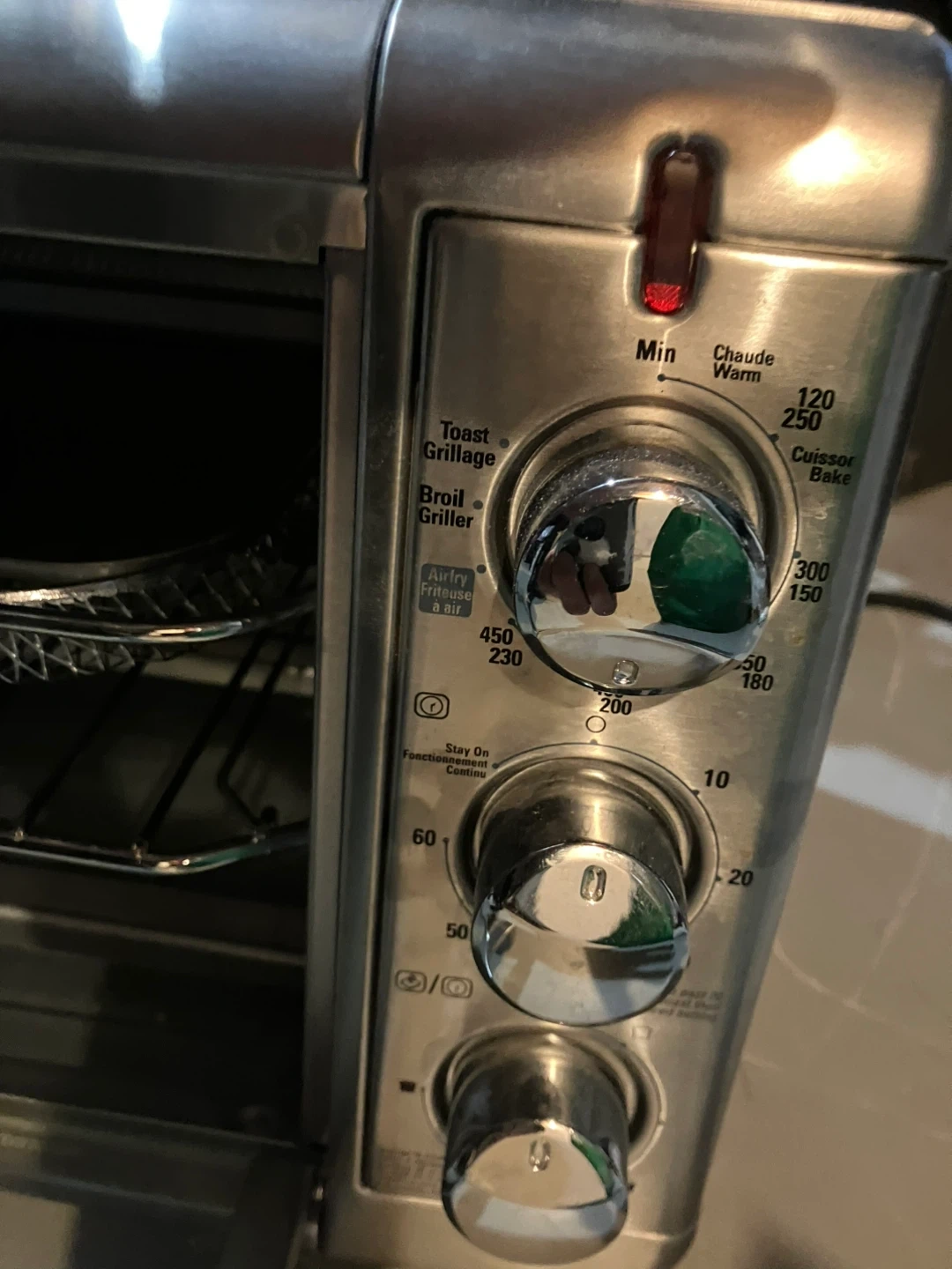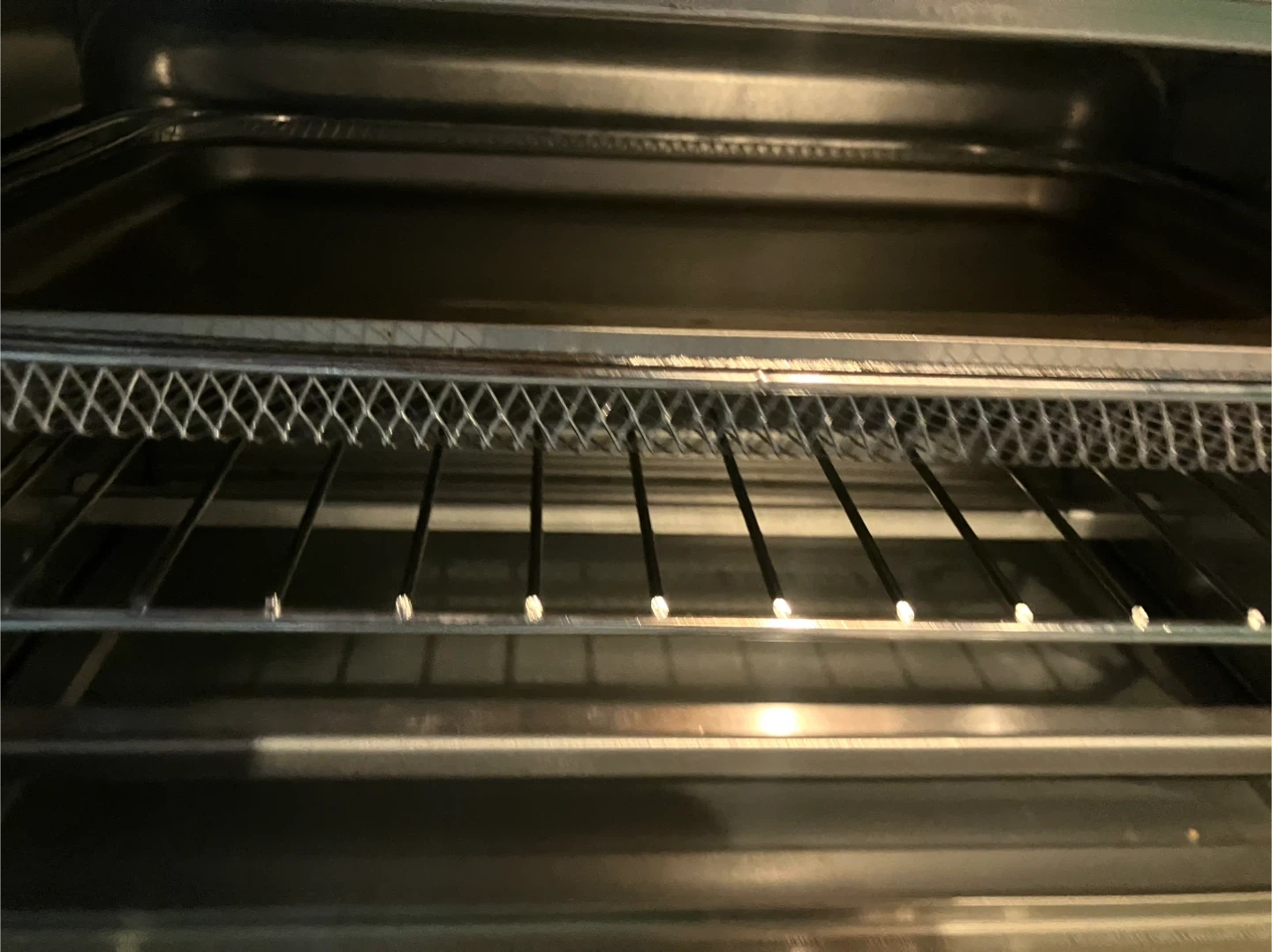 Stainless steel Black+Decker toaster oven with air fryer function. It's a versatile kitchen appliance for toasting, broiling, baking, and air frying. Includes a bake tray and air fry basket.