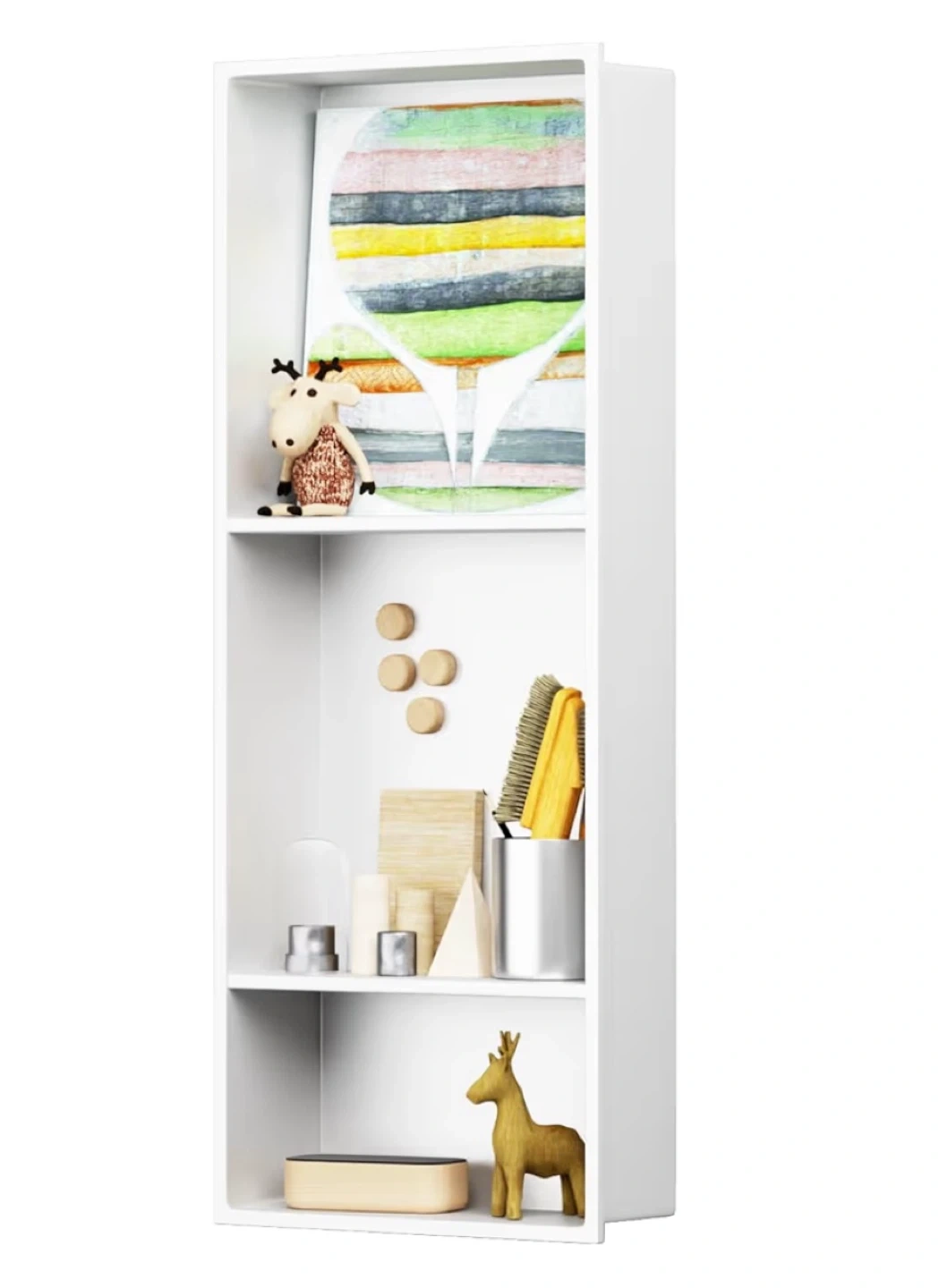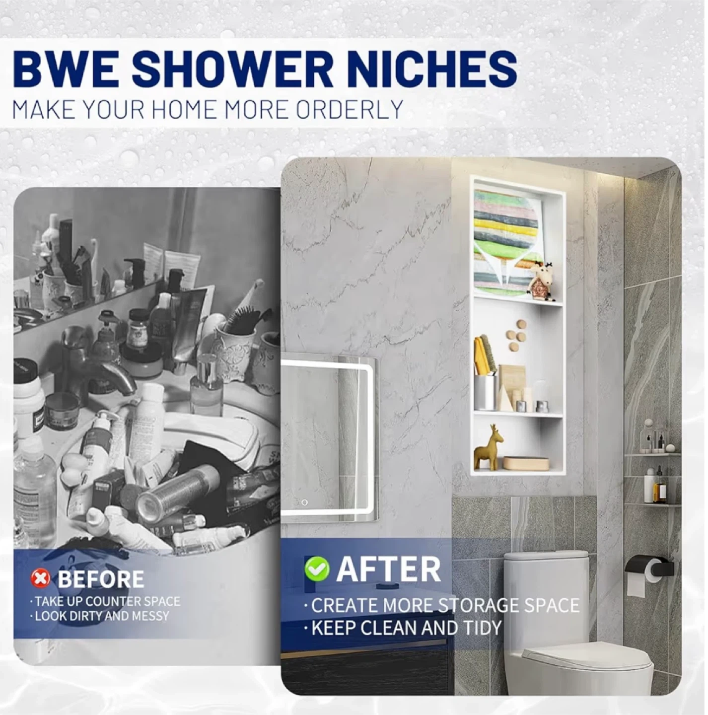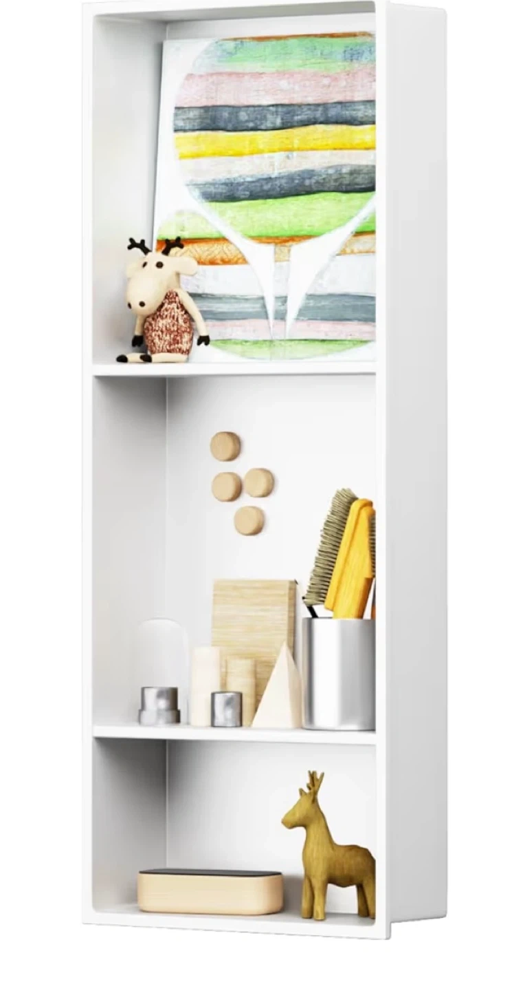 This BWE shower niche is constructed from SUS 304 stainless steel for durability. It features seamless welding ensuring leak-free and waterproof performance. It's suitable for bathrooms, cabinets, bookshelves, and kitchens.
