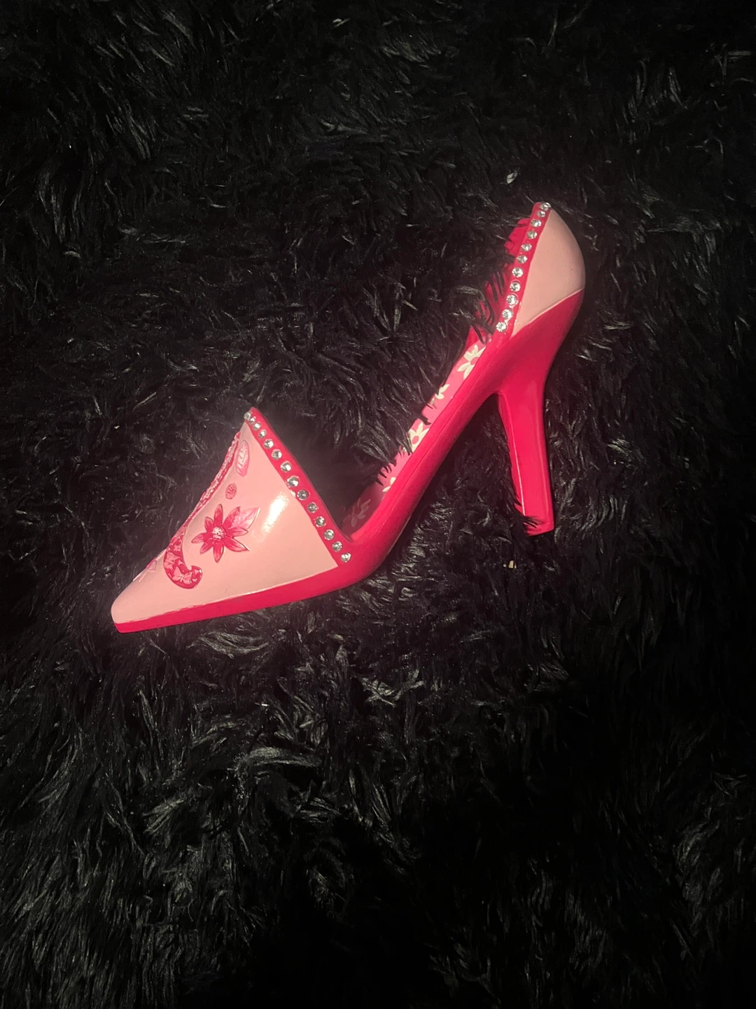 This is a decorative high heel shoe figurine. It's pink with red accents and floral designs. Clear embellishments line the edges of the shoe.