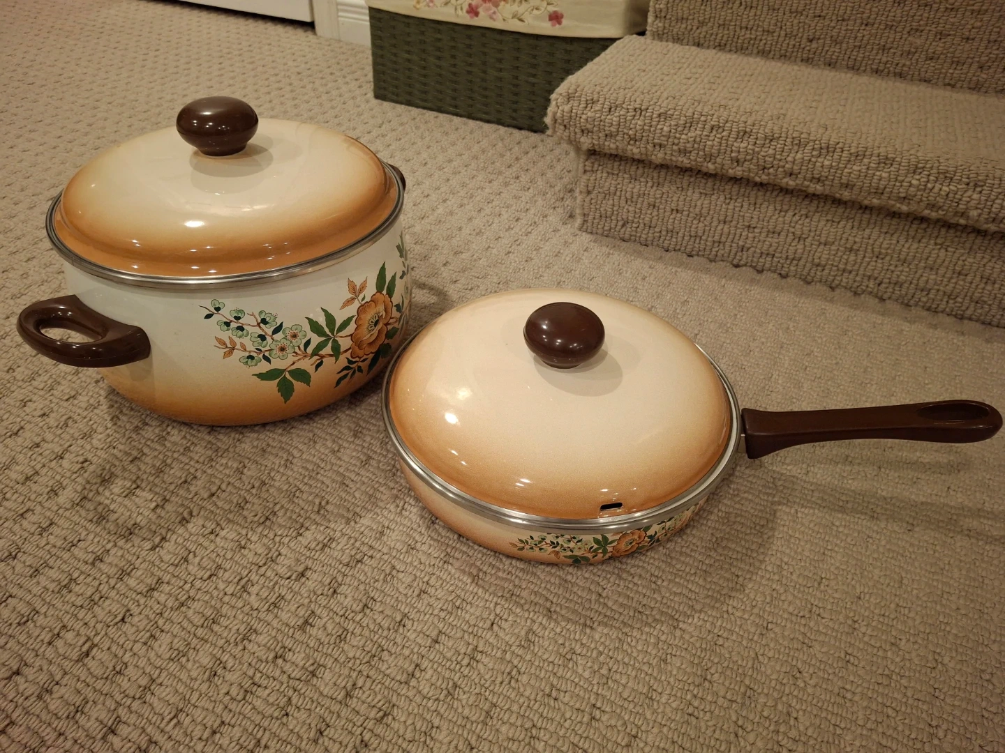 This is a set of French enamelware cookware with a floral design. It includes a large pot with a lid and a frying pan with a lid. The cookware is white with an orange gradient and floral accents.