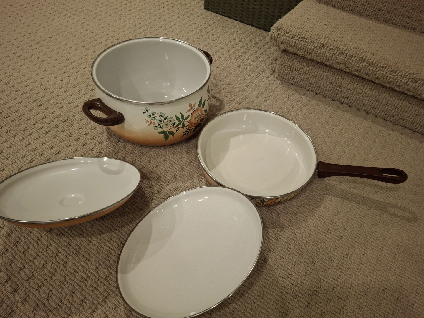 This is a set of French enamelware cookware with a floral design. It includes a large pot with a lid and a frying pan with a lid. The cookware is white with an orange gradient and floral accents.